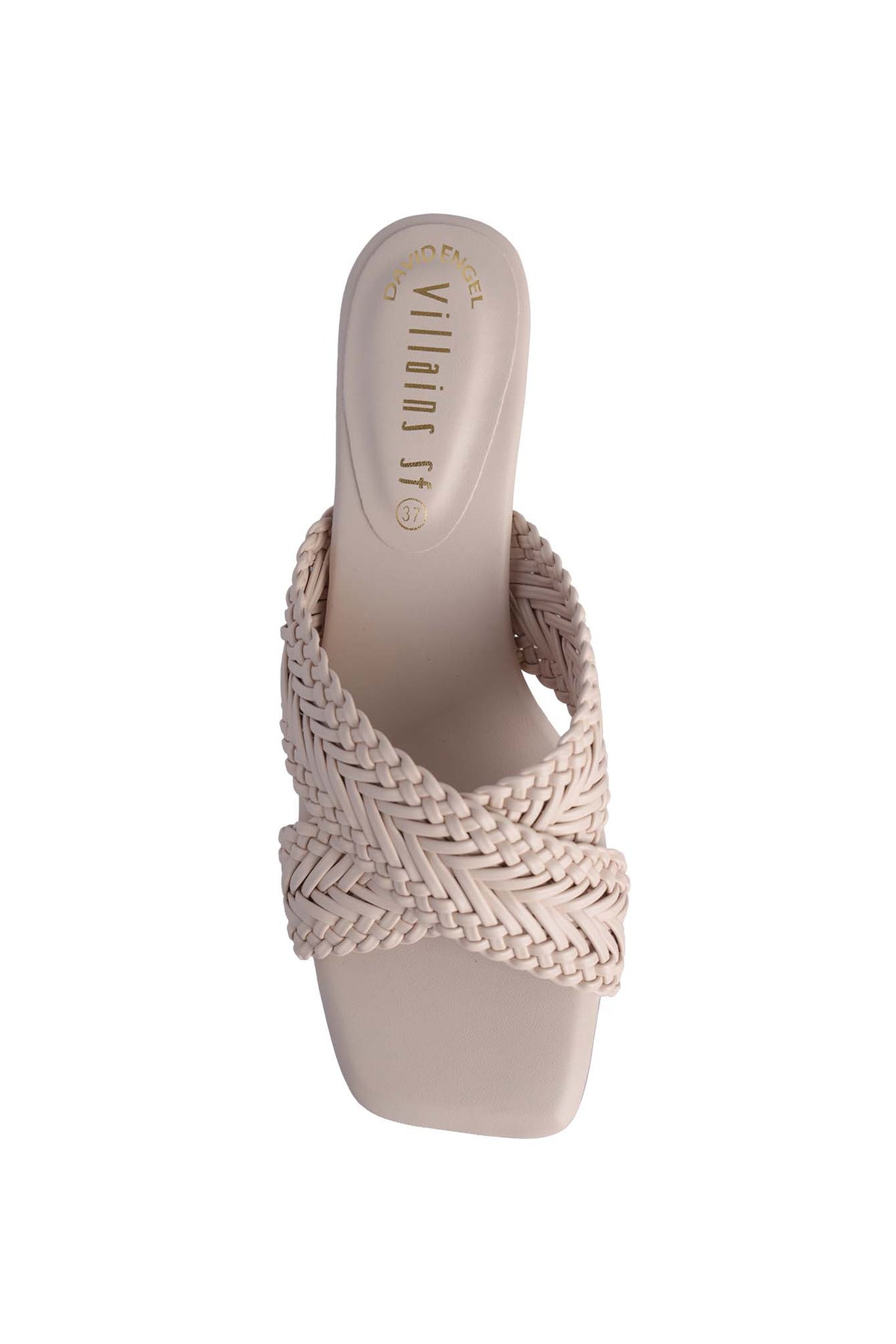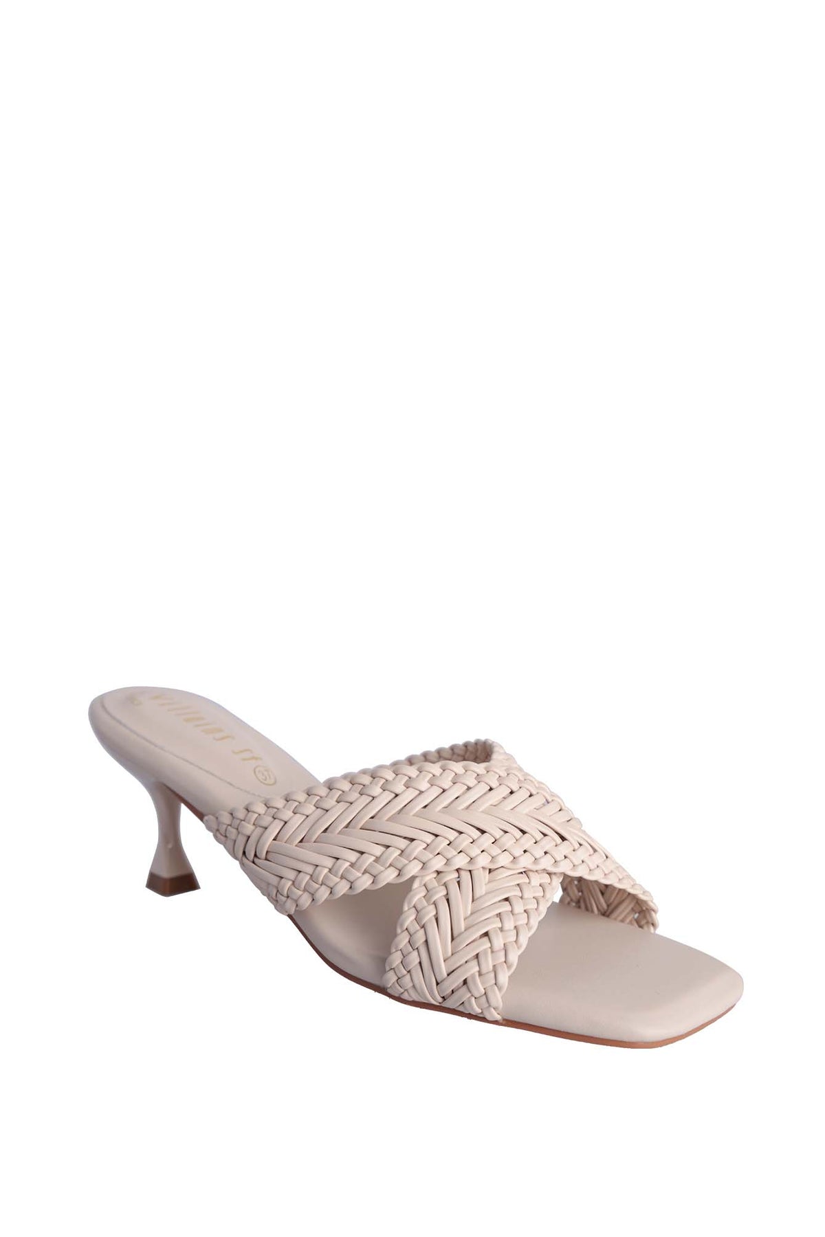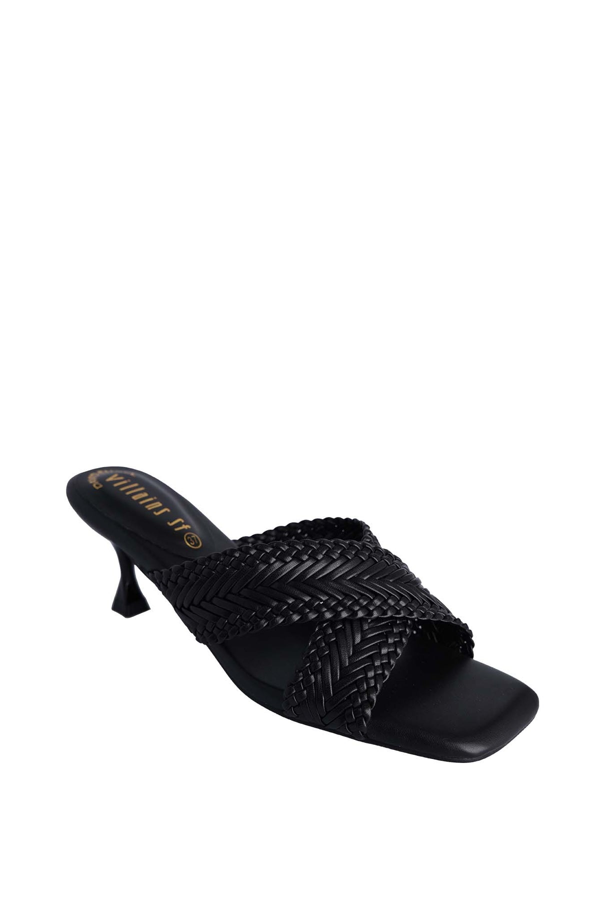 ORI-DAY women sandals with a mid-height heel. Feature a slip-on design strap, making them easy to slide on and off. Upper part has an elegant woven or braided leather pattern that creates an interesting textural detail across the front strap. classic stiletto or tapered shape. The sole looks to be made of leather or a similar material in black. The overall style is sophisticated and suitable for both casual and semi-formal occasions.