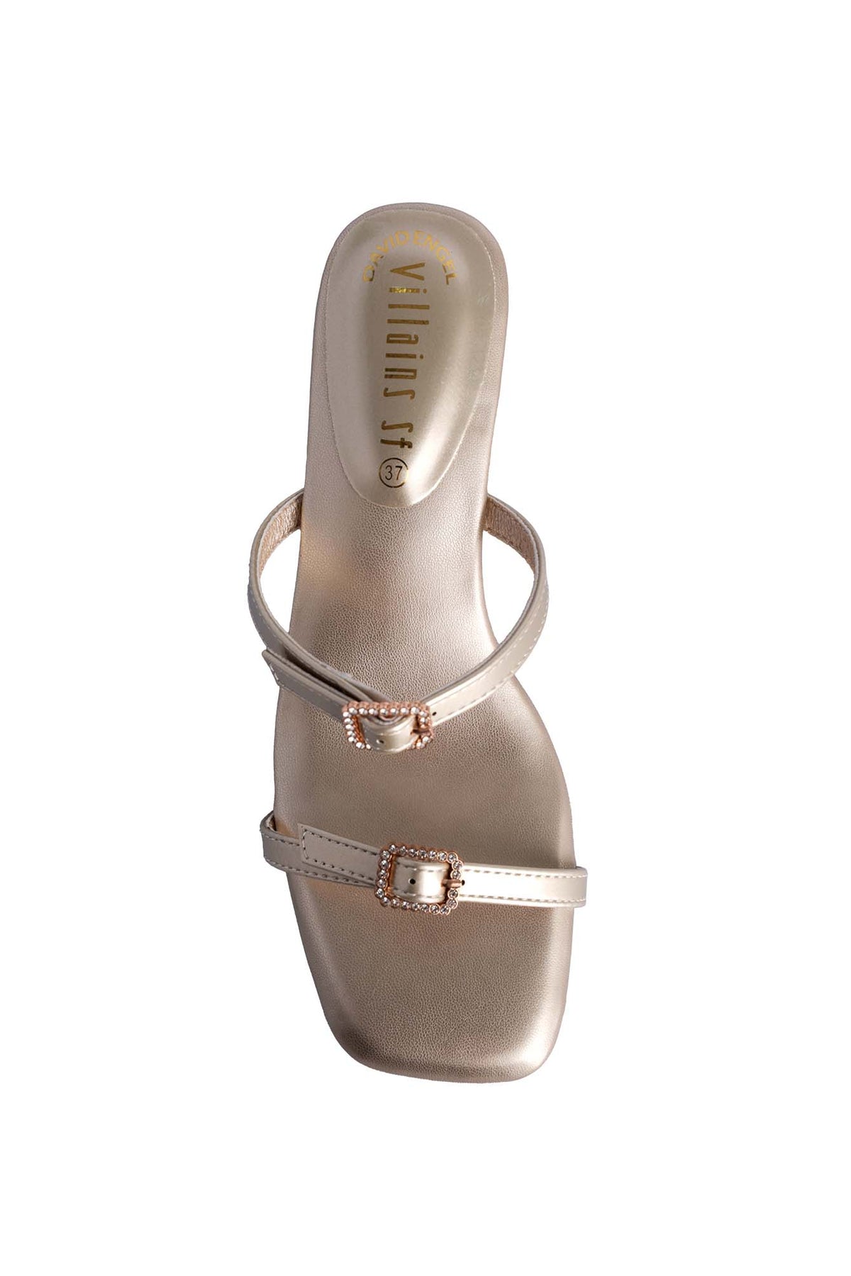 SWAY slip-on sandals featuring a soft cushioned sole for added comfort. The design includes two slim straps, each adorned with a shiny square buckle embellished with small, giving the sandals a chic and feminine look. The low block heel makes them easy to wear while still adding a touch of sophistication. Perfect for both casual and semi-formal occasions.