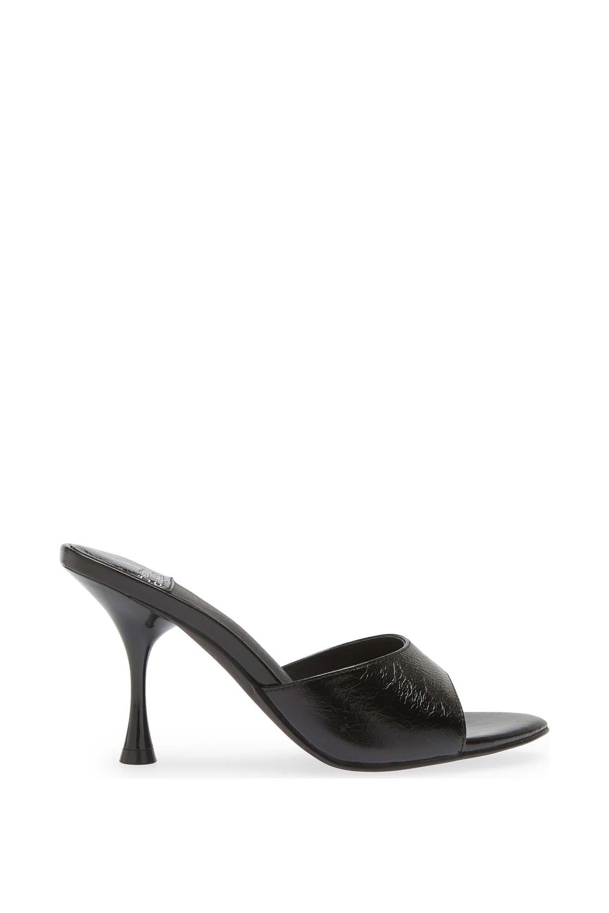 AGENT heel mules.Designed by Jeffrey Campbell sold by Villains SF. Feature sleek, minimalist design with a single wide strap across the front. Square open toe, giving a modern and elegant silhouette. Sculpted hourglass heel thin in the middle and flaring slightly at the base, that adds a fashionable and architectural touch. slip-on style, offering both convenience and chic appeal.