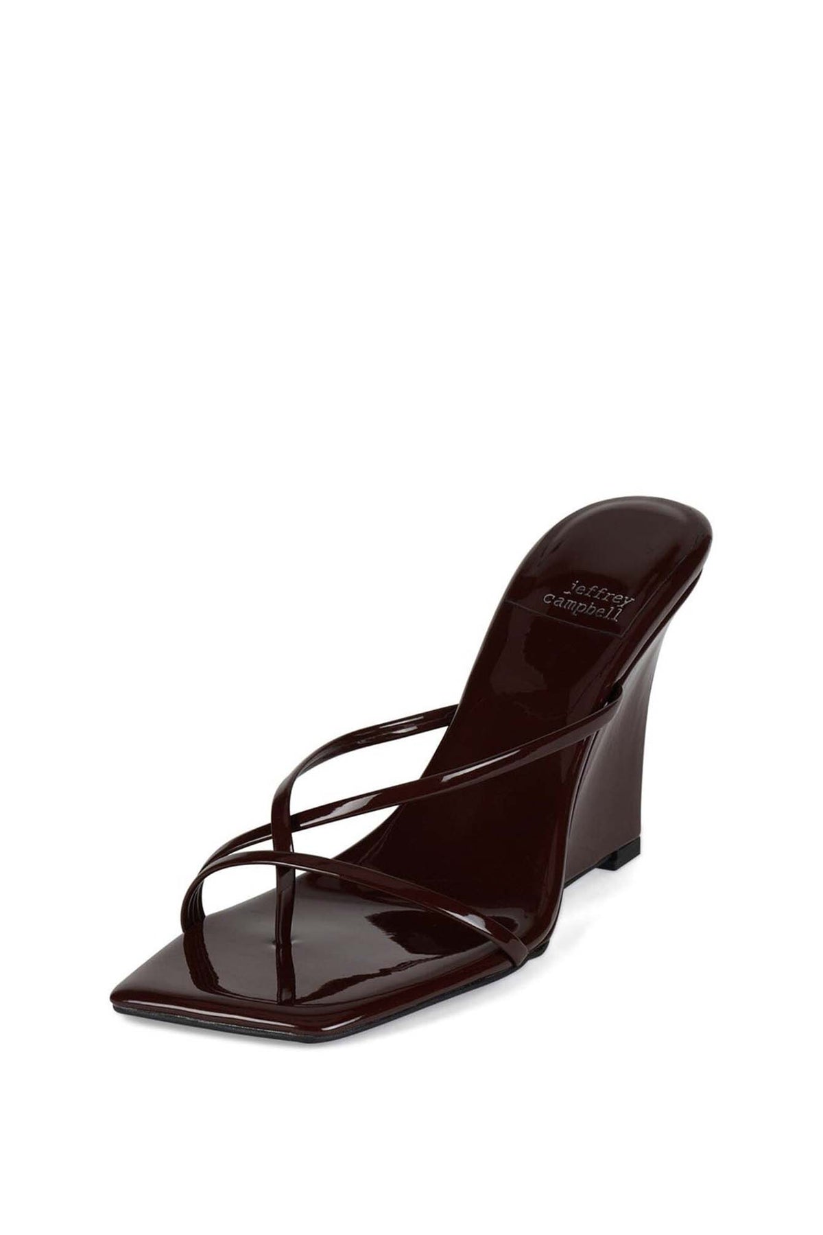 Biscotti high-heeled wedge sandals with a modern, minimalist design. Designed by Jeffrey Campbell sold by Villains SF. Feature a trendy square toe shape. Upper consists of thin, delicate straps arranged in a thong or toe-post design, with one or more straps crossing over the foot.