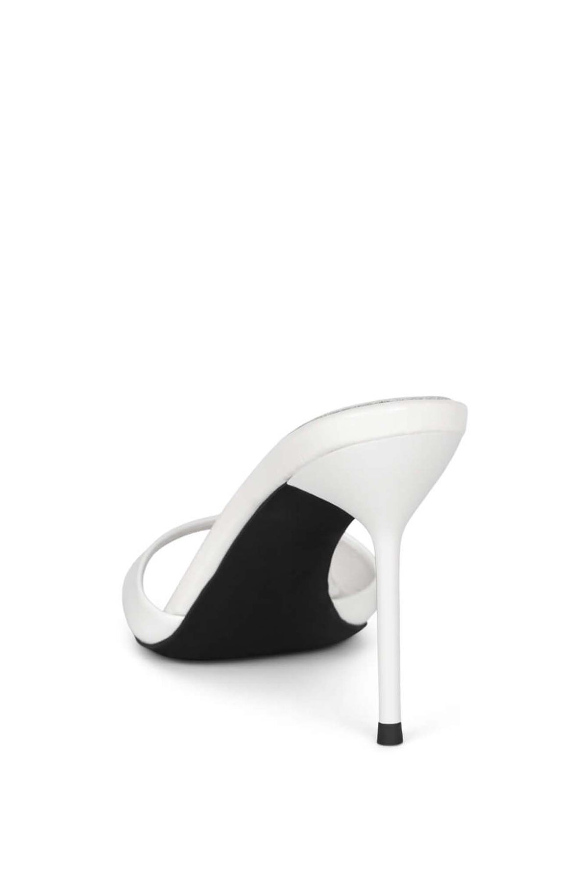 Ce-Soire high-heeled mule. Designed by Jeffrey Campbell sold by Villains SF. It features a shiny, patent finish and a single strap across the toes. The shoe has a very high, thin stiletto heel and a slight platform under the toes, giving it a modern and provocative look. It's a slip-on style.