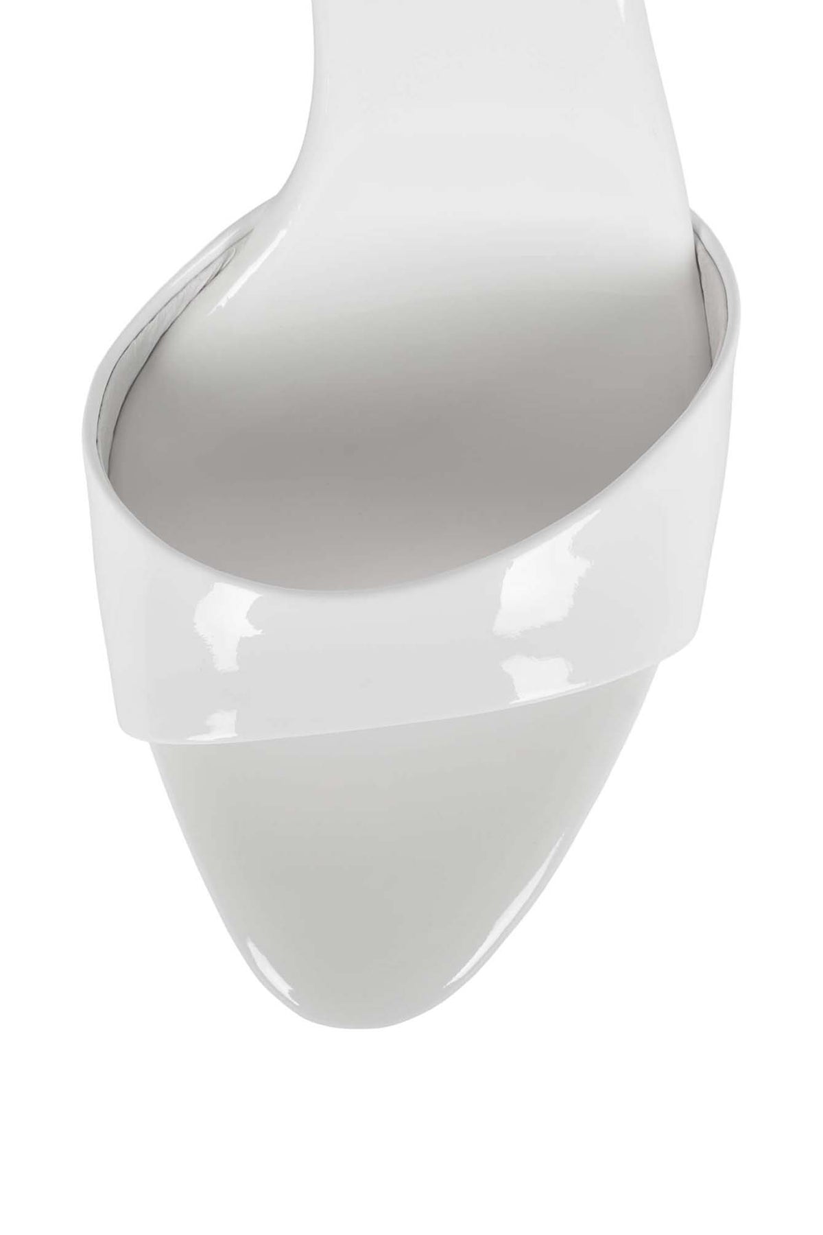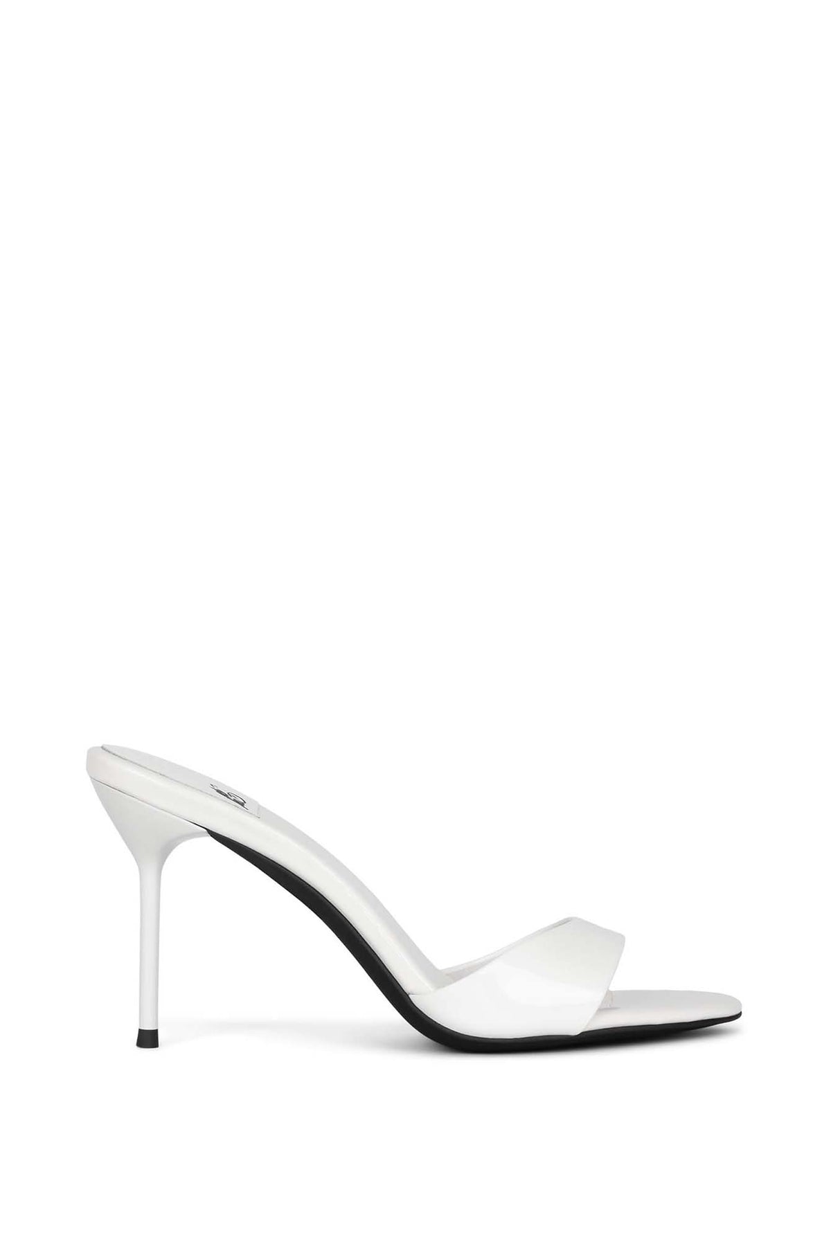 Ce-Soire high-heeled mule. Designed by Jeffrey Campbell sold by Villains SF. It features a shiny, patent finish and a single strap across the toes. The shoe has a very high, thin stiletto heel and a slight platform under the toes, giving it a modern and provocative look. It's a slip-on style.