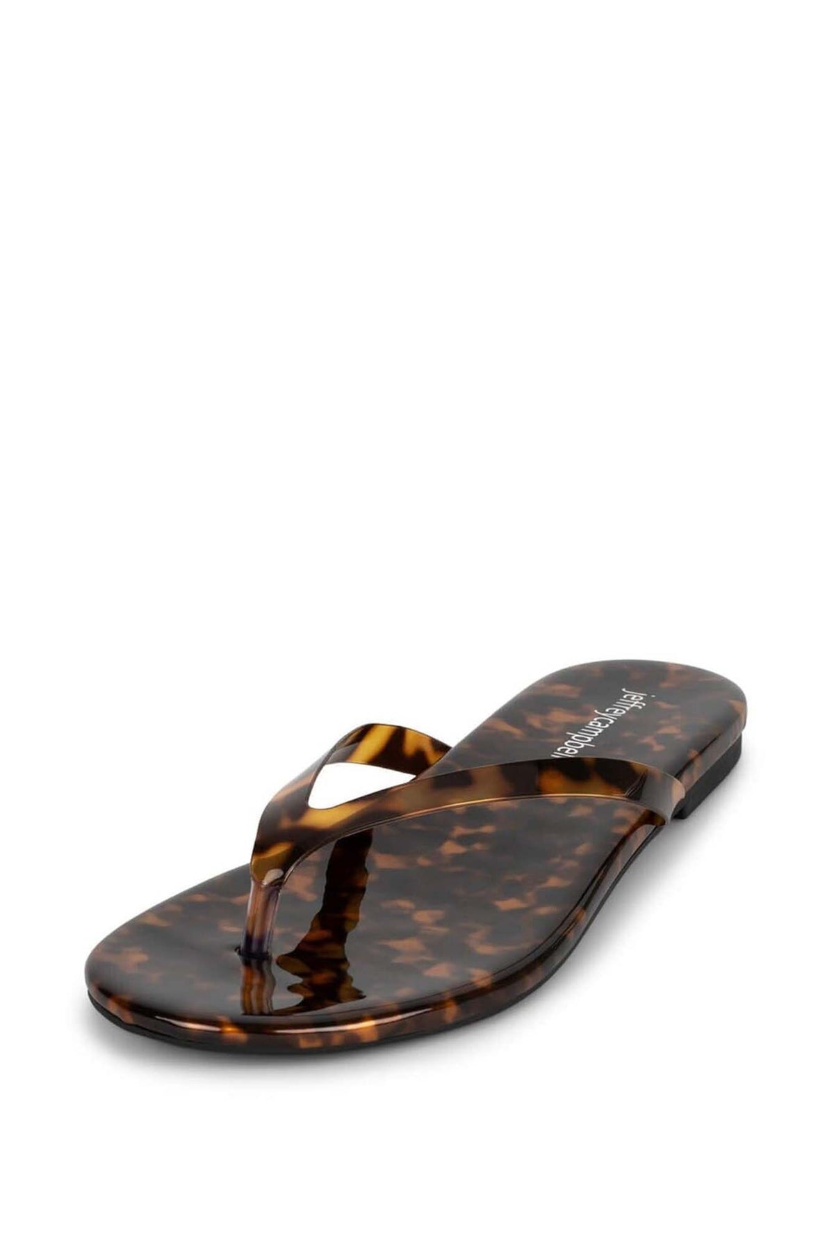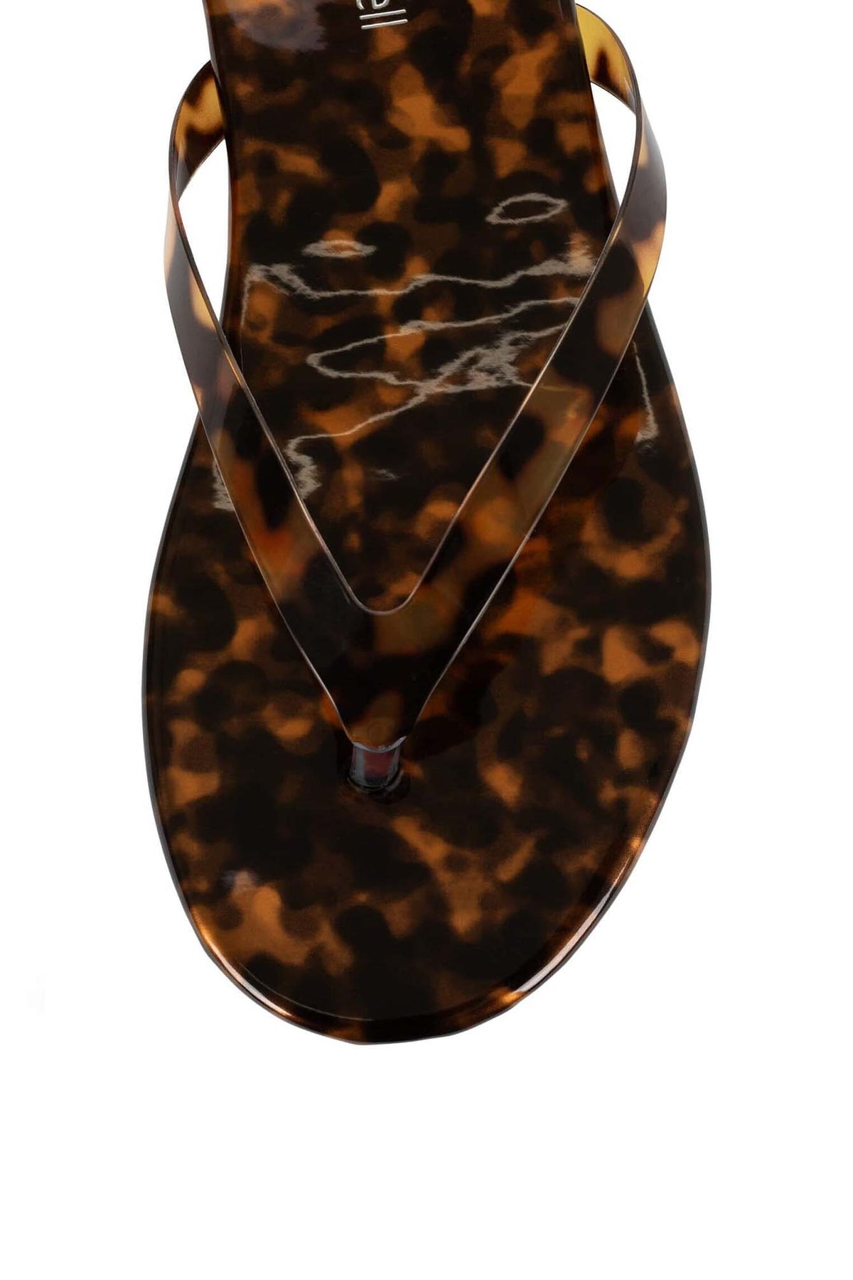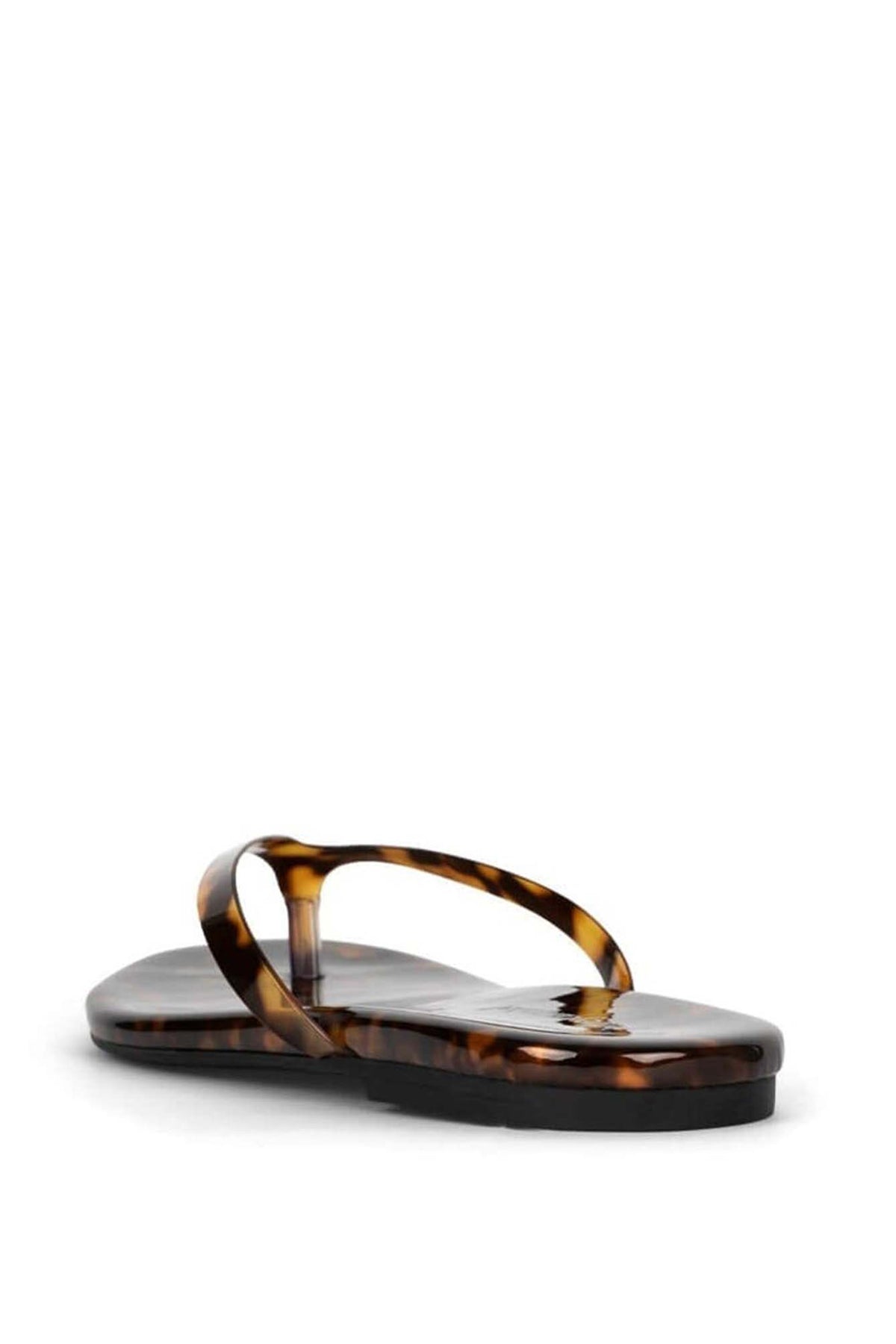KIERRA flat sandals designed in a sleek and minimal flip-flop style. The sandal features glossy tortoiseshell-patterned straps and a matching sole, giving it a chic and sophisticated look. The thin thong strap crosses between the toes for a simple yet elegant design. Made from smooth, durable synthetic material, this sandal combines comfort and fashion, perfect for casual wear, easy to wear.