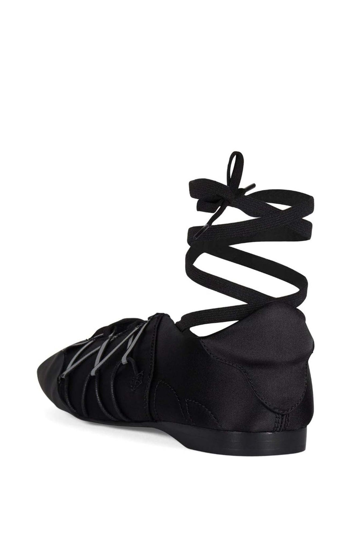 M-V-P Designed by Jeffrey Campbell sold by Villains SF. features a unique ballet-inspired design. Lace-up straps wrap elegantly around the ankle, creating a feminine and playful look. The toe and sole, adding a modern twist to the classic ballet flat silhouette. The shoe combines comfort and style, ideal for both casual and fashion-forward outfits.