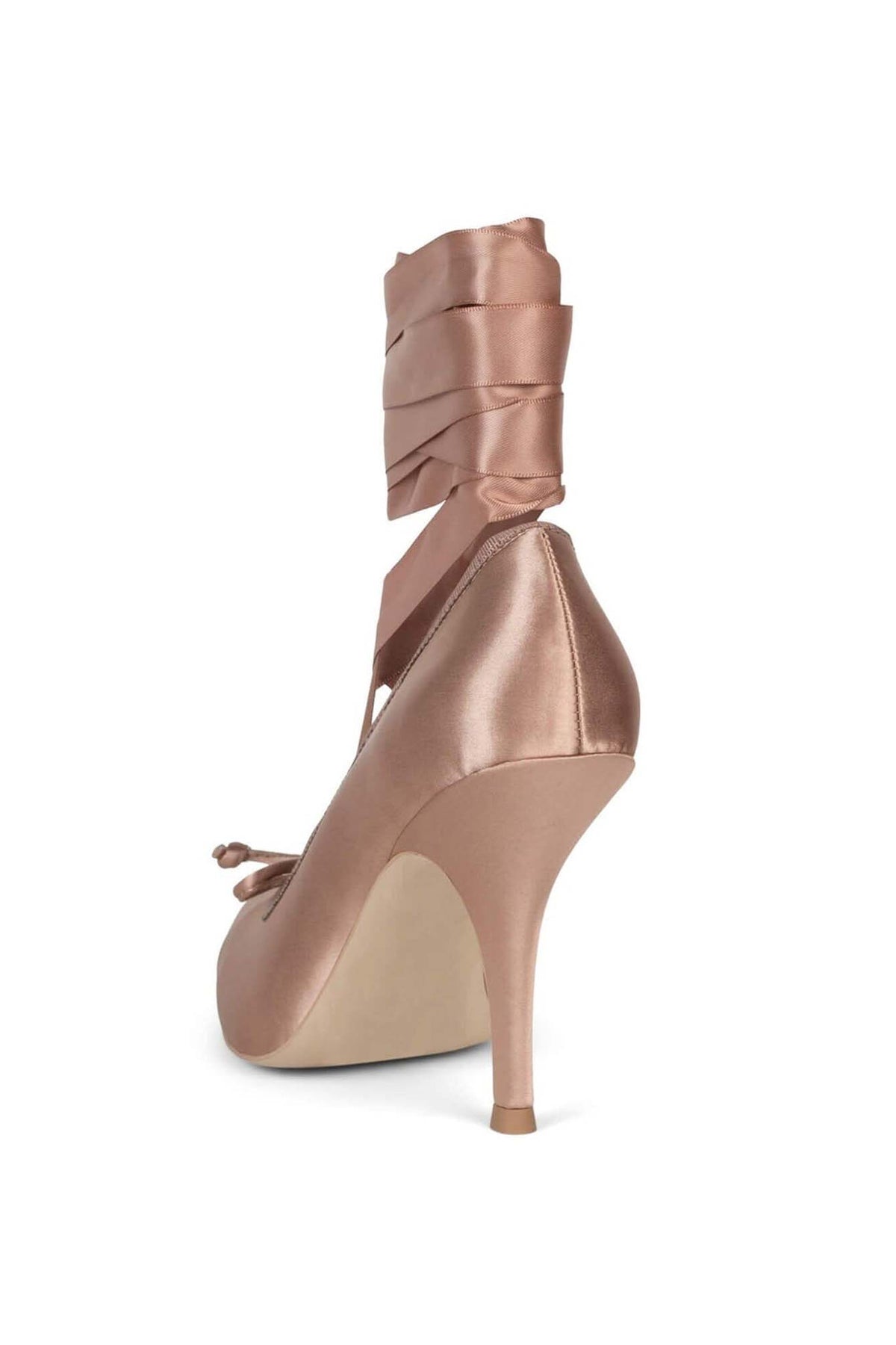 Nympha high-heeled pumps with a ballet-inspired style, often referred to as "ballet heels" or "ballerina pumps. Designed by Jeffrey Campbell sold by Villains SF. Shoes takes inspiration from a ballet slipper, featuring a rounded or slightly square toe and a delicate bow or tie detail at the front, reminiscent of a ballet flat. Feature ribbons are designed to be wrapped & tied around the ankle or calf much like a pointe shoes.