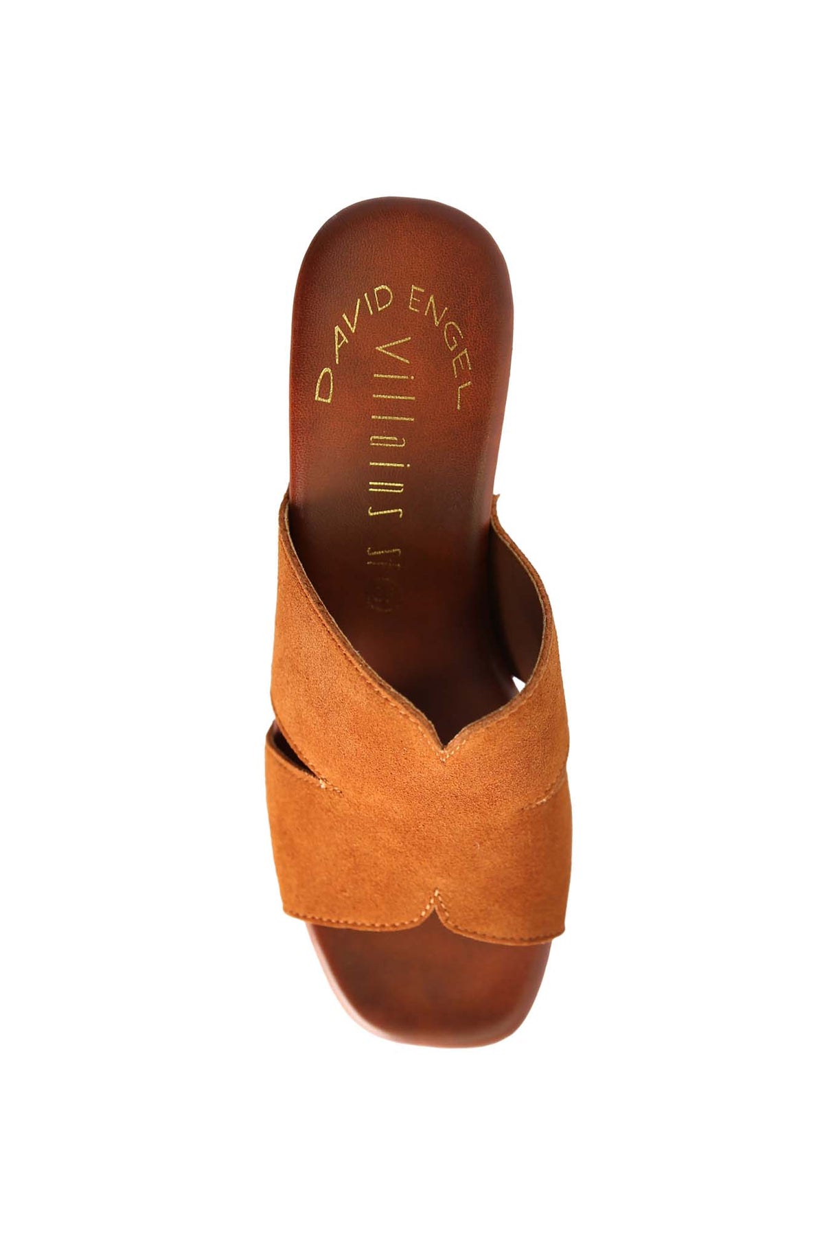 SILKEN SOUL platform mule sandals featuring a chunky wooden heel and sole. The upper part is made of suede material with a crisscross cut design. Gold-tone studs decorate the sides where the upper meets the sole, adding a stylish and retro touch. The sandals combine both comfort and height, suitable for casual or vintage-inspired outfits.