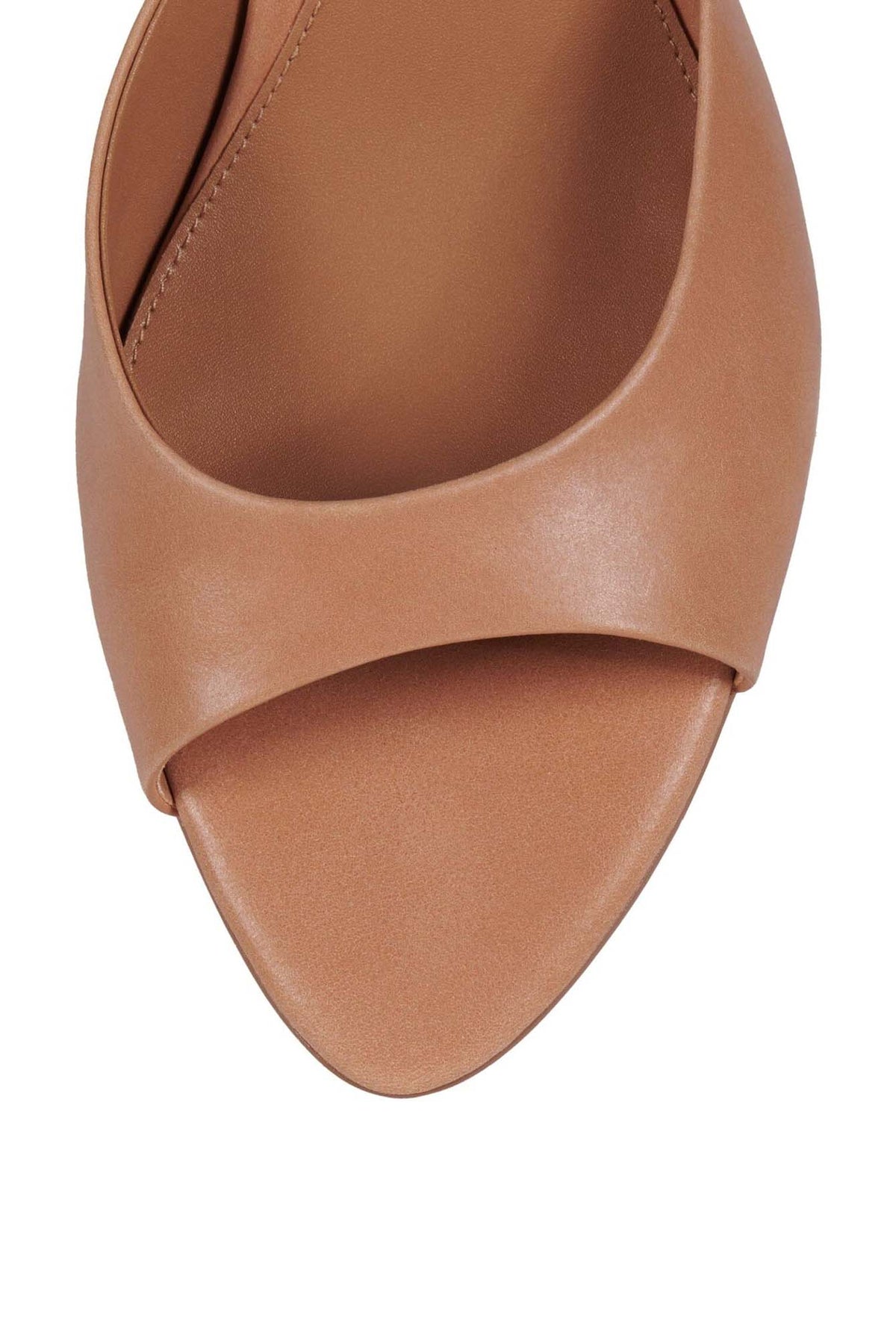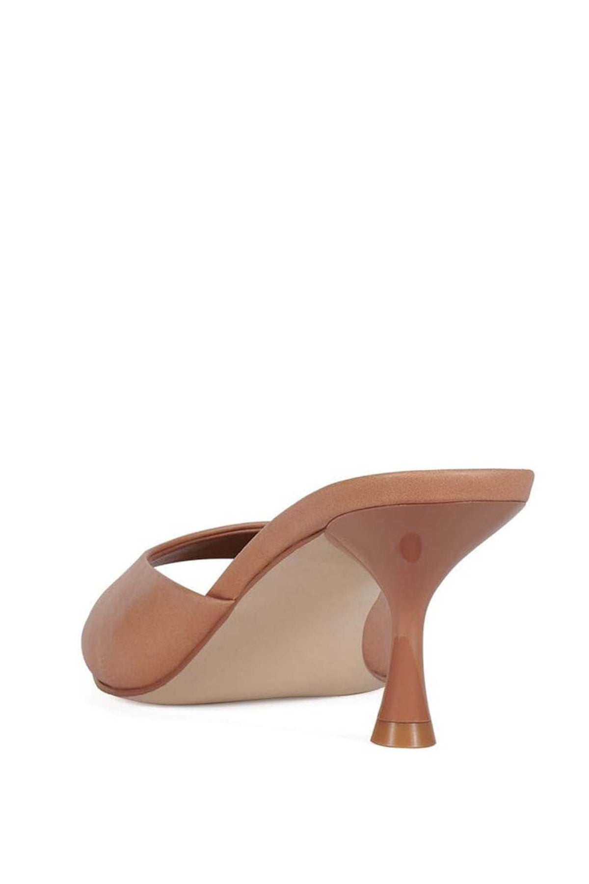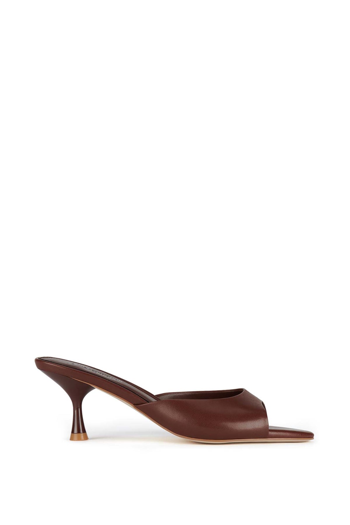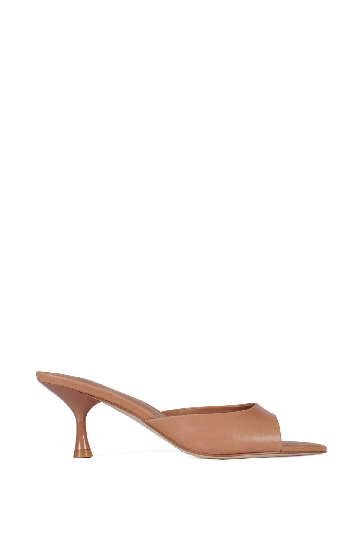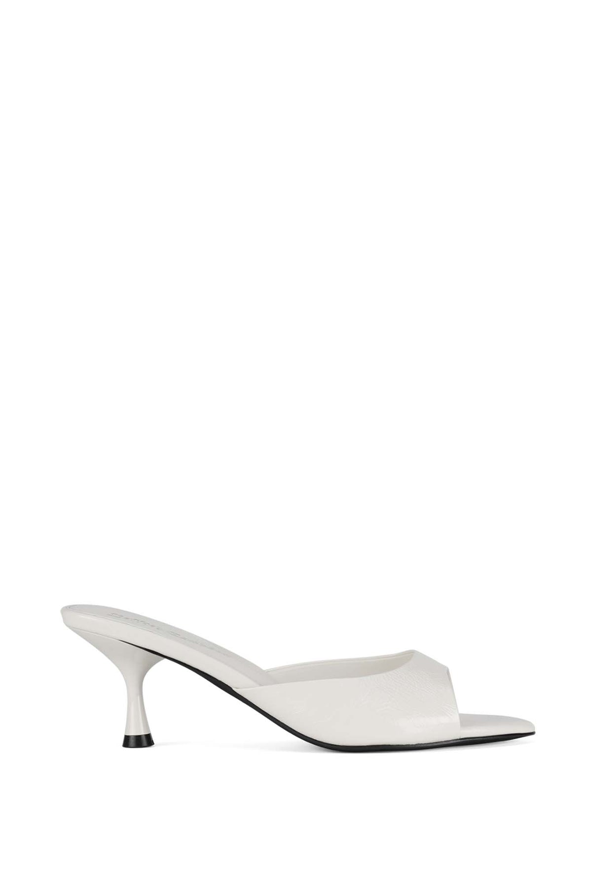 SPY-KID heel mules. Designed by Jeffrey Campbell sold by Villains SF. Featuring a slip-on design and a mid-height flared heel. The shoe has an open toe with a wide single strap across the front, giving it a sleek and modern silhouette. The glossy finish adds a sophisticated and chic touch, making it suitable for both casual and dressy.