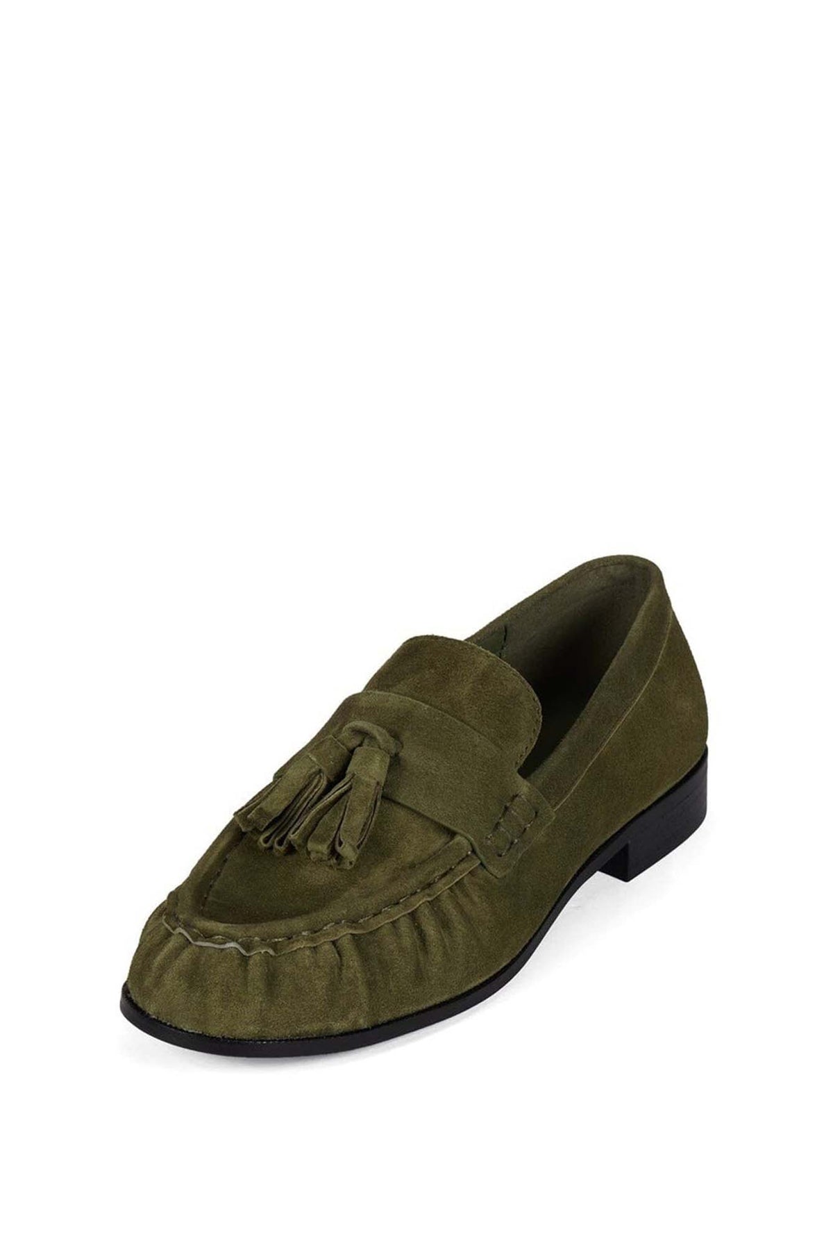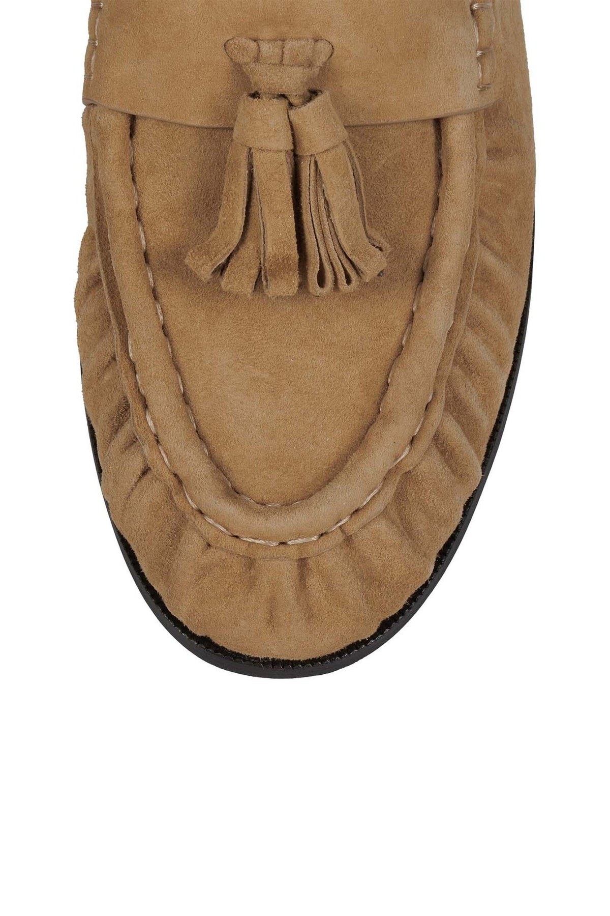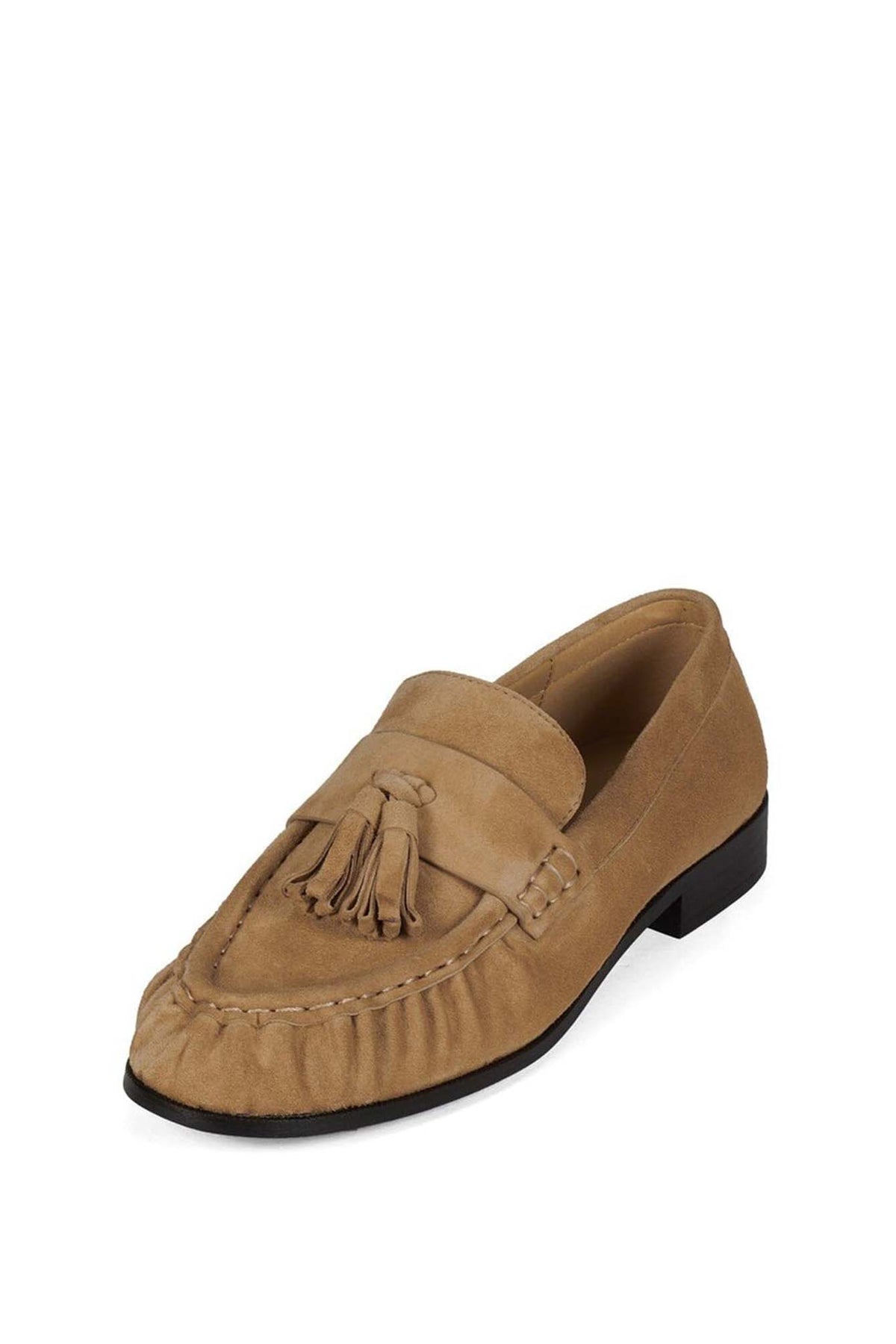 ARTICULATE Step into effortless sophistication with these refined tassel loafers. Crafted with a soft suede upper and detailed moccasin stitching, they offer a timeless silhouette with subtle ruching across the vamp. The low stacked heel ensures all-day comfort, while the sleek slip-on design makes styling easy. A polished essential for modern wardrobes.