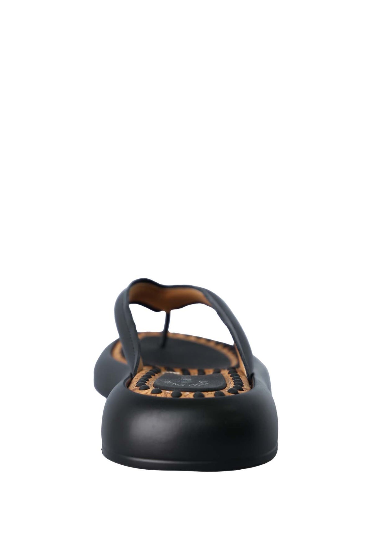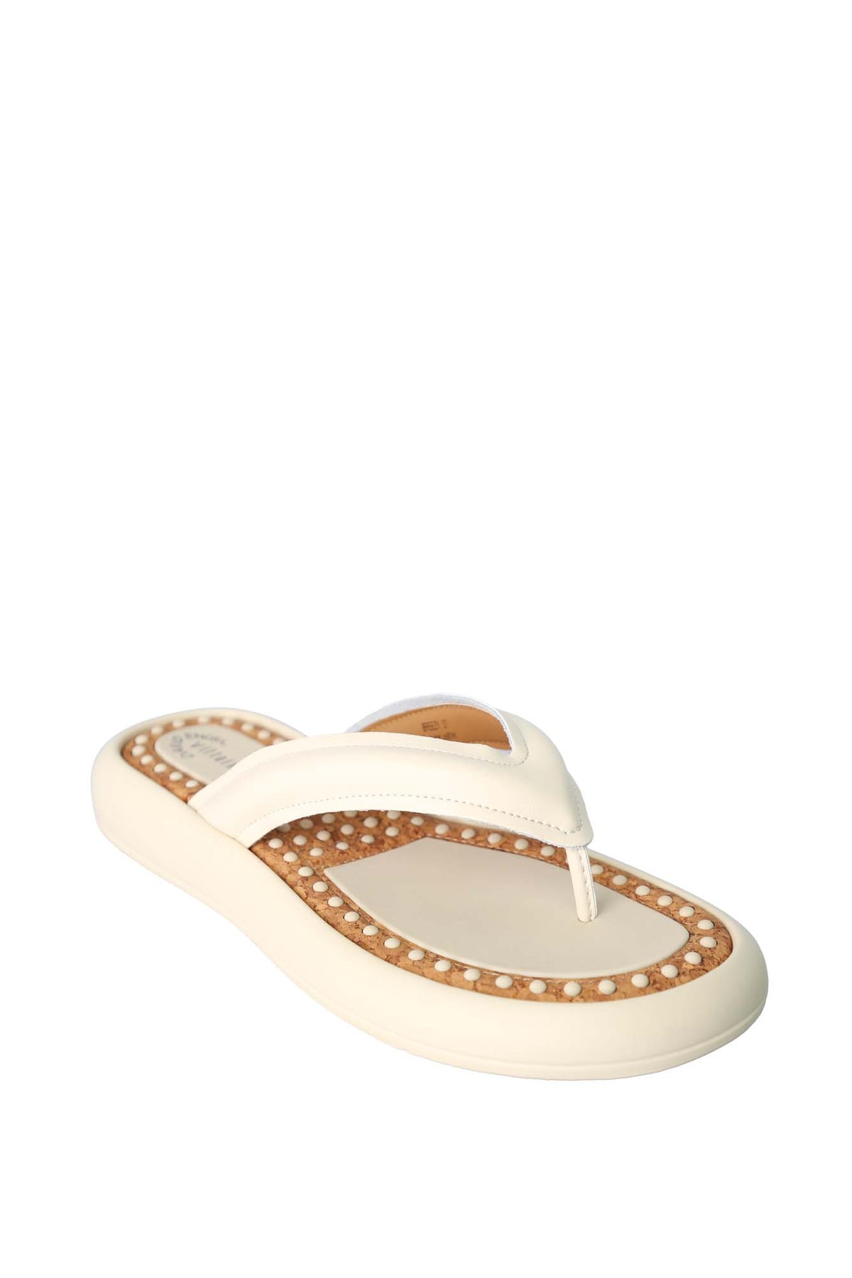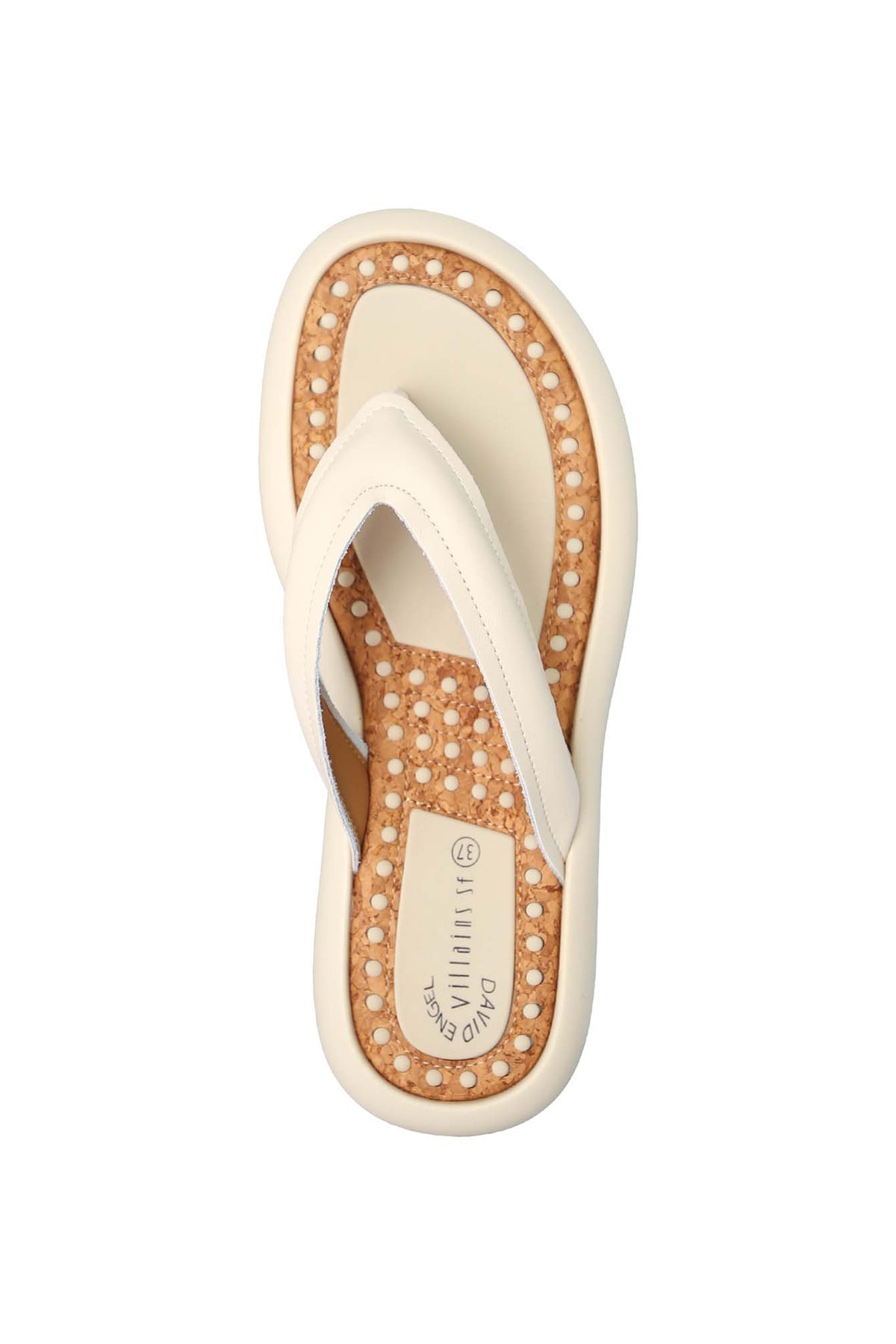 BREEZY sandal style. Features a wide, comfort shoes, along with a toe post for secure wear. The footbed combines a smooth surface with a cork-like border that has a circular cut-out pattern, adding a decorative and breathable touch. The sole is slightly elevated and cushioned, offering both comfort and casual elegance. This sandal blends modern design with functionality, making it suitable for everyday wear.