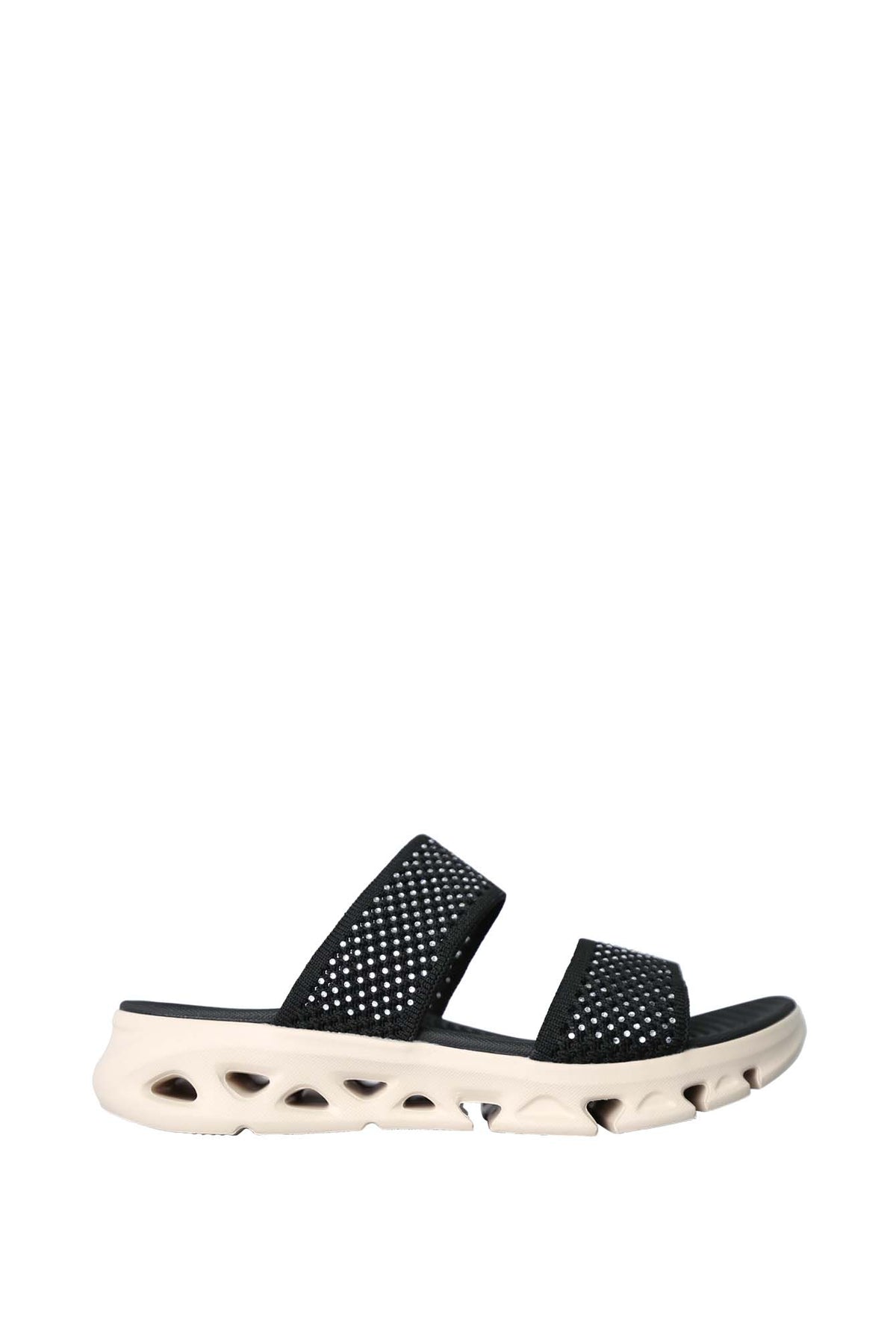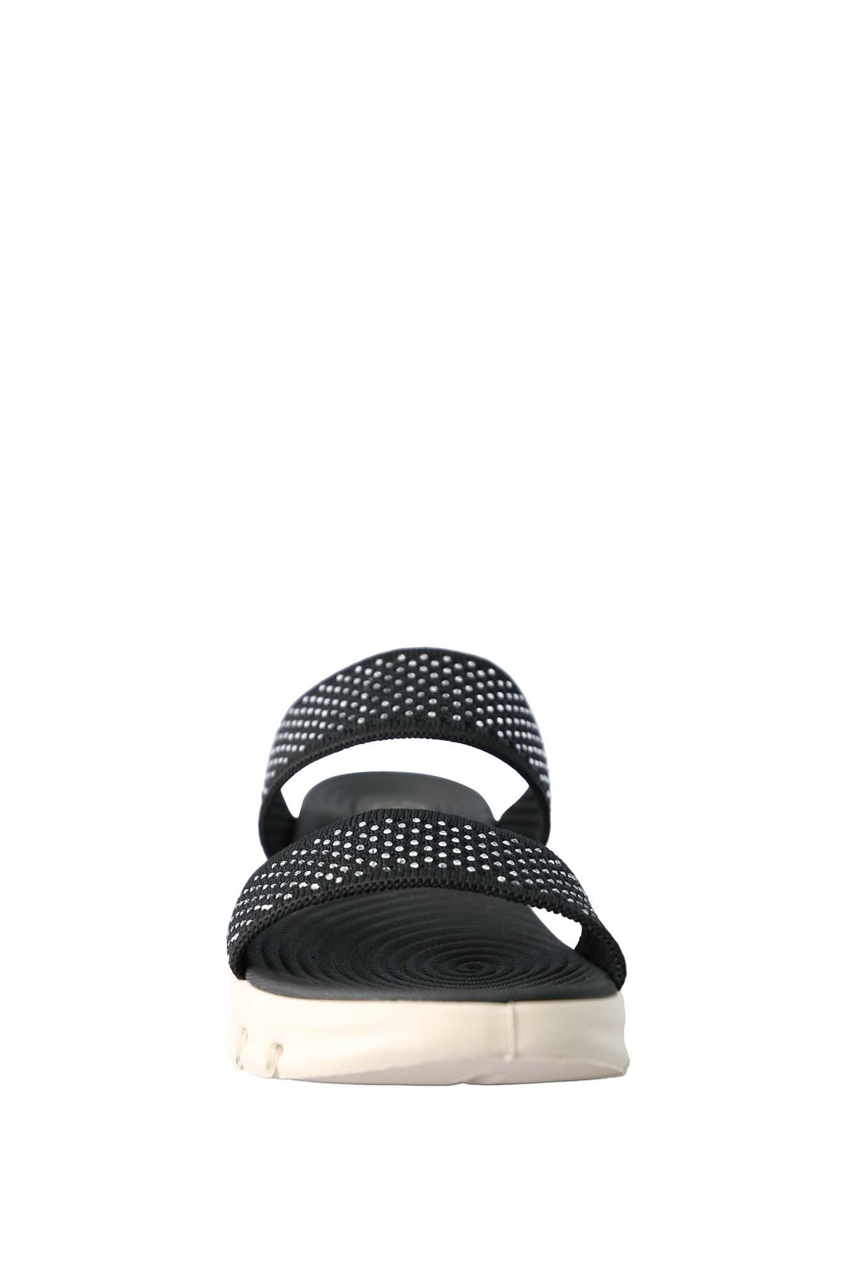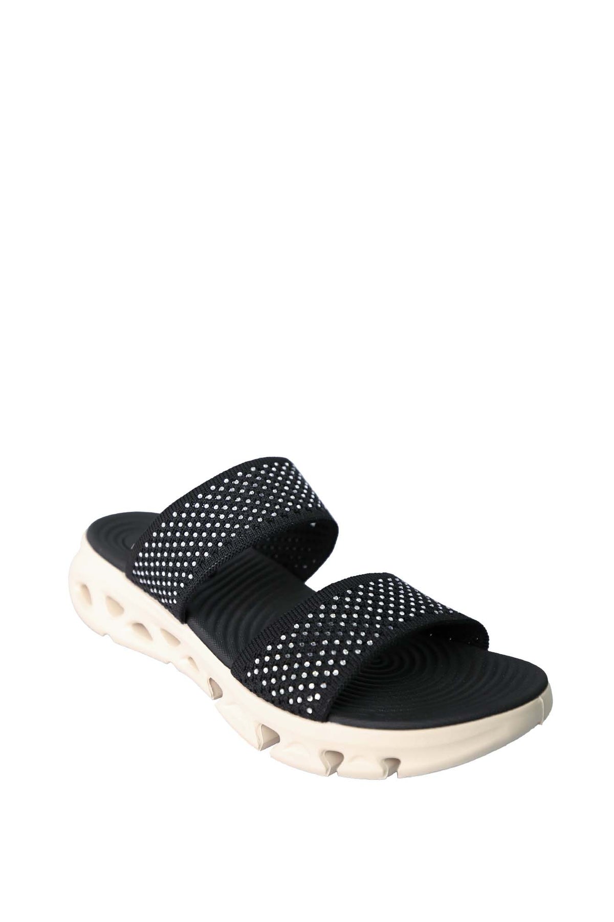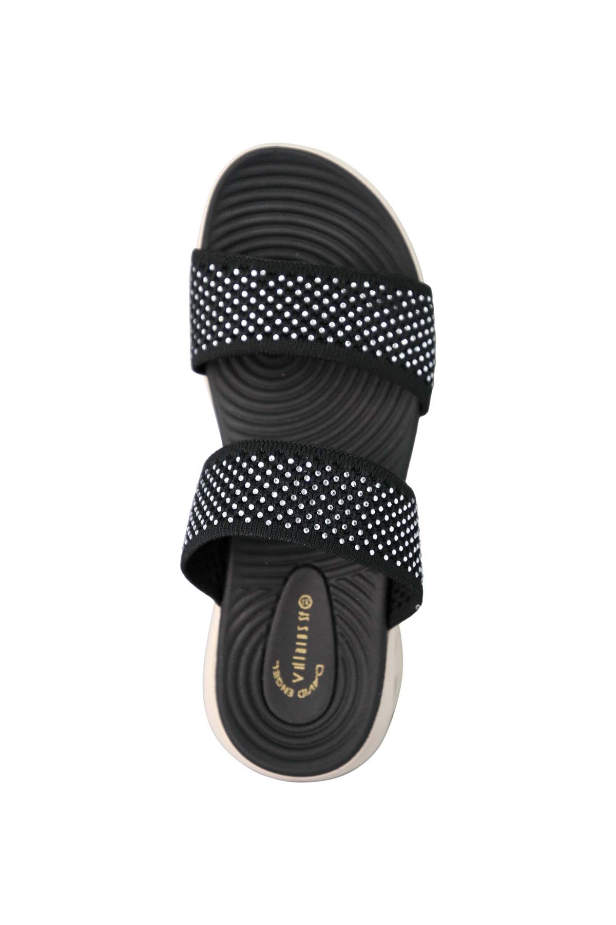 FLOW comfort sandal. fashionable design. It features two wide black fabric straps adorned with shimmering rhinestones that add a touch of elegance and sparkle. Features is the lightweight, The sole includes innovative cut-out grooves, which not only reduce weight but also enhance shock absorption and flexibility during walking. This design allows for a natural foot movement and improved traction.