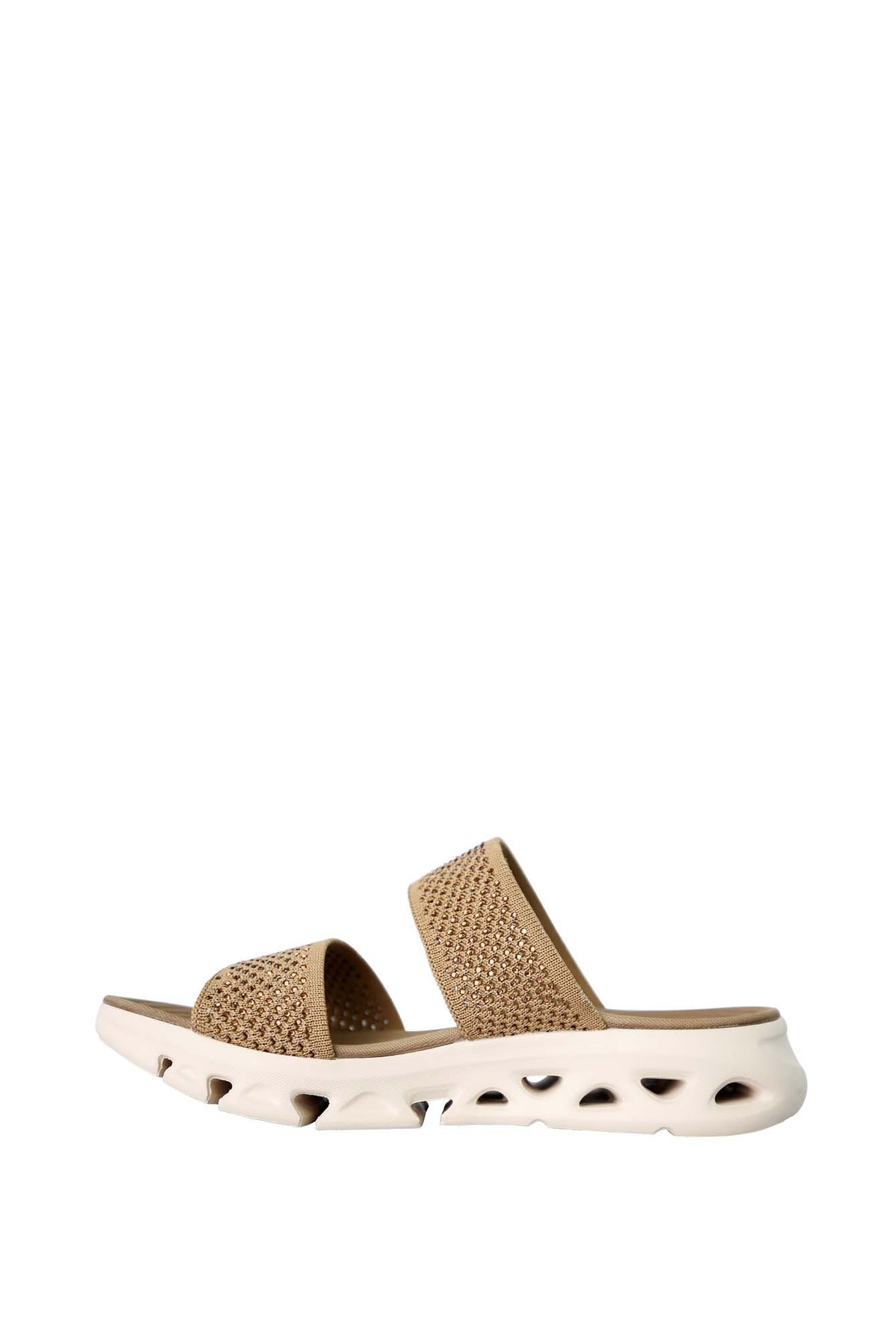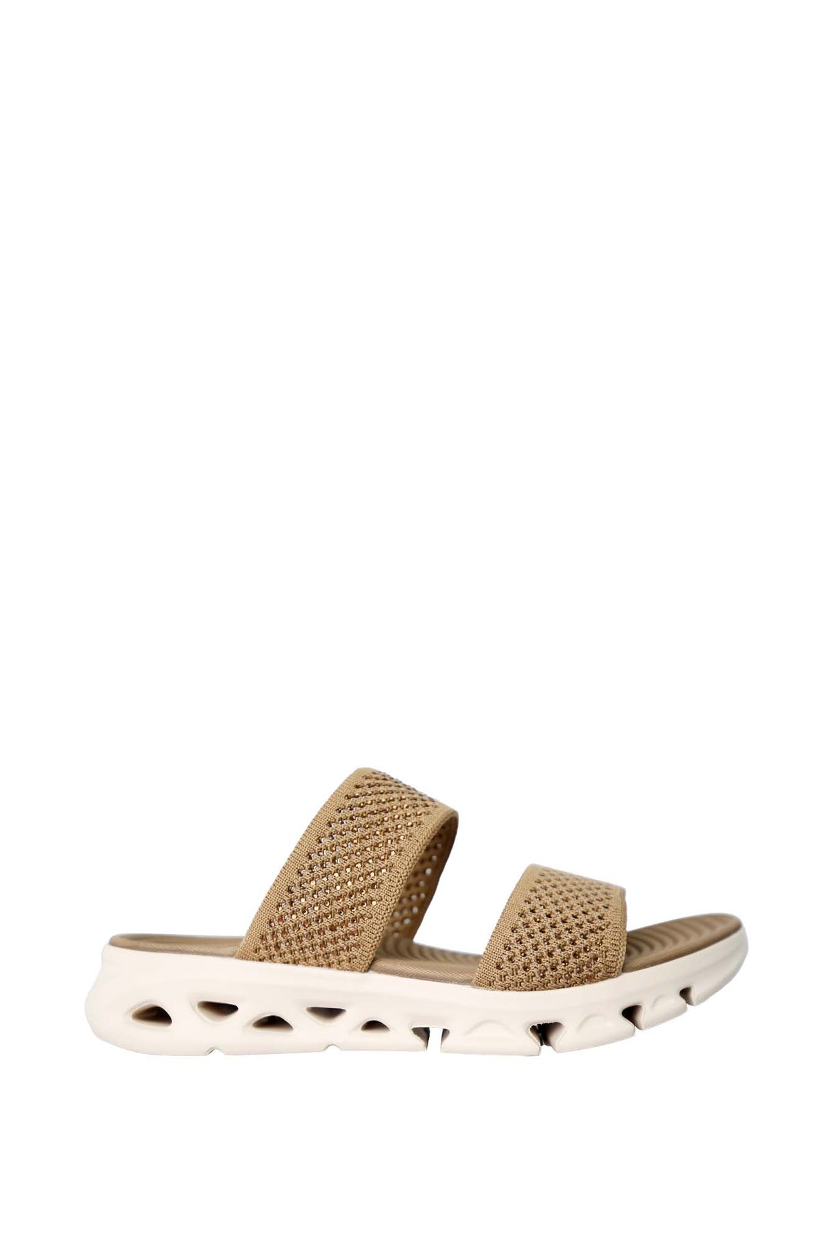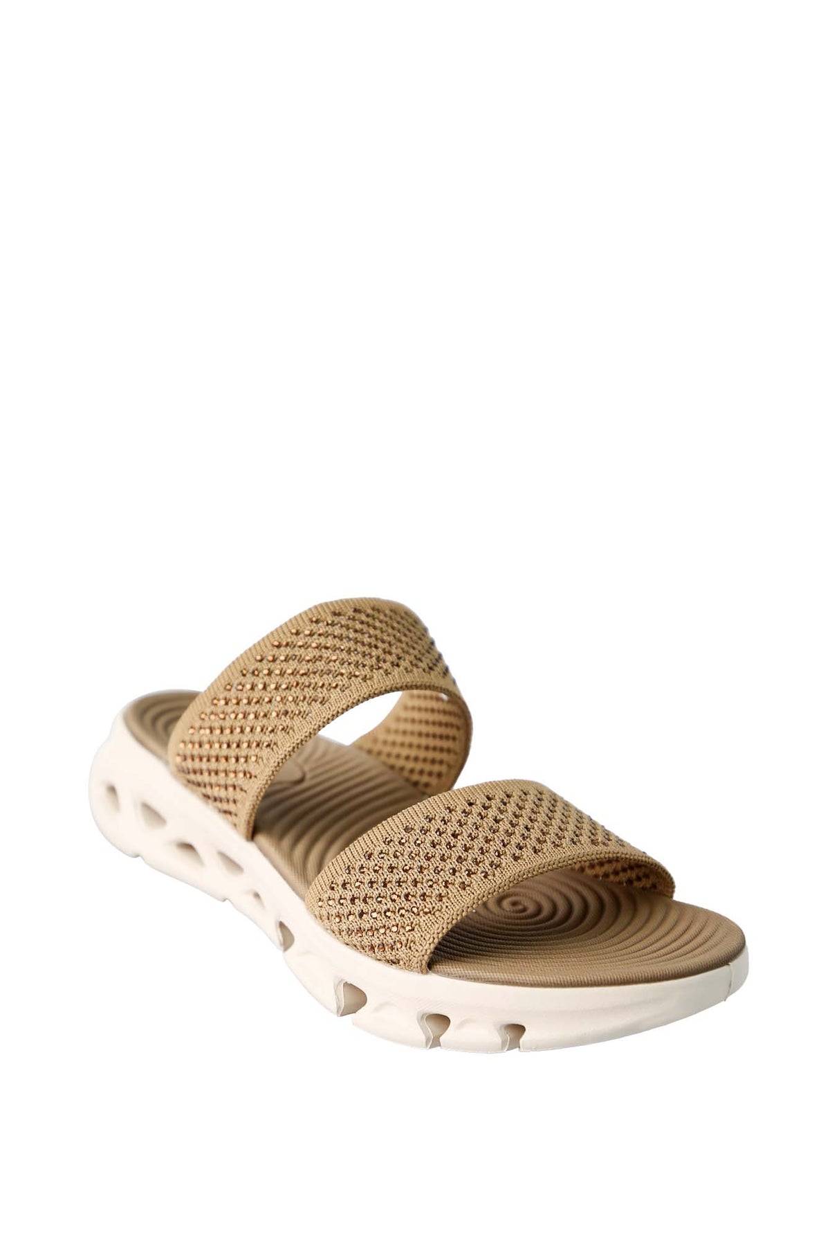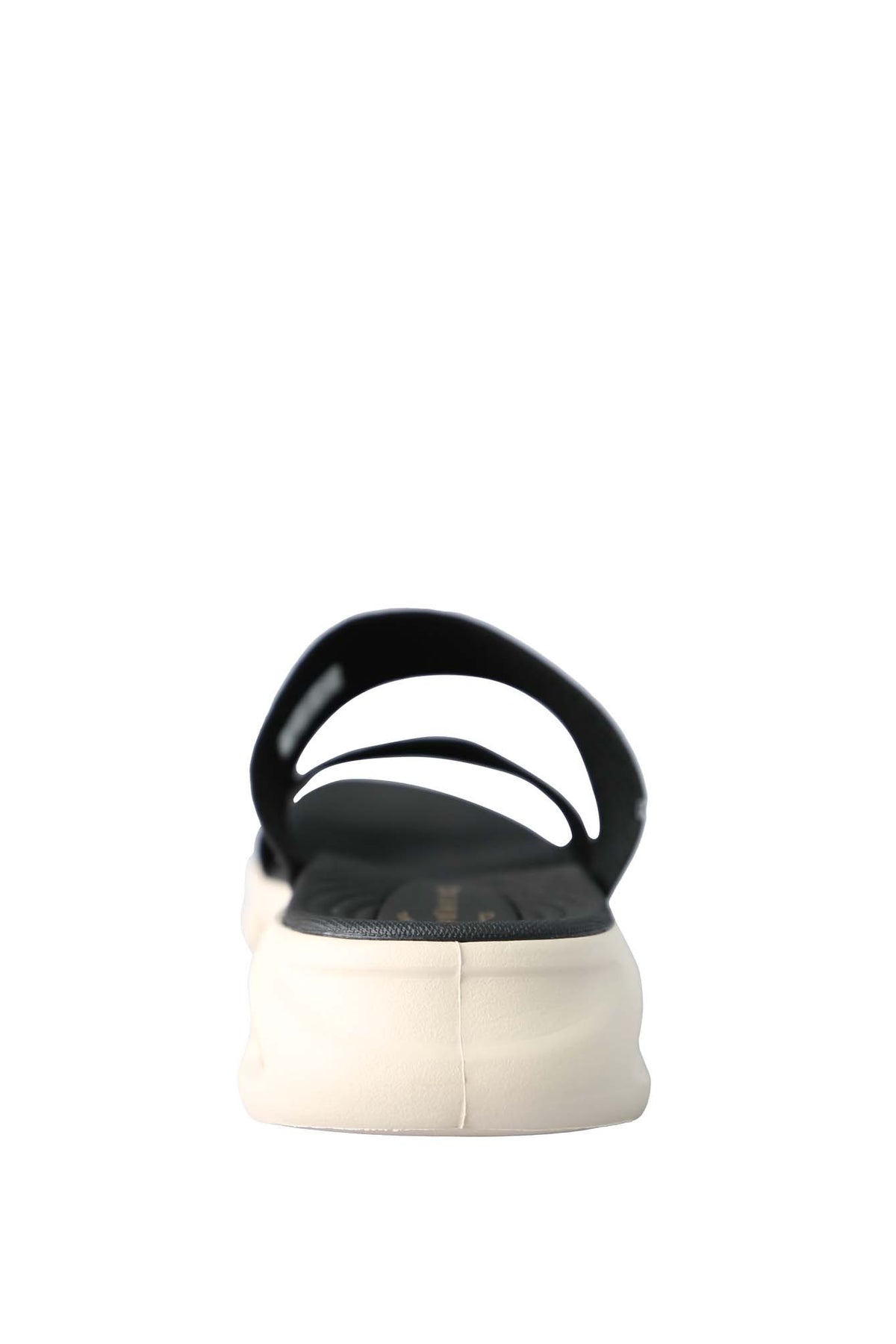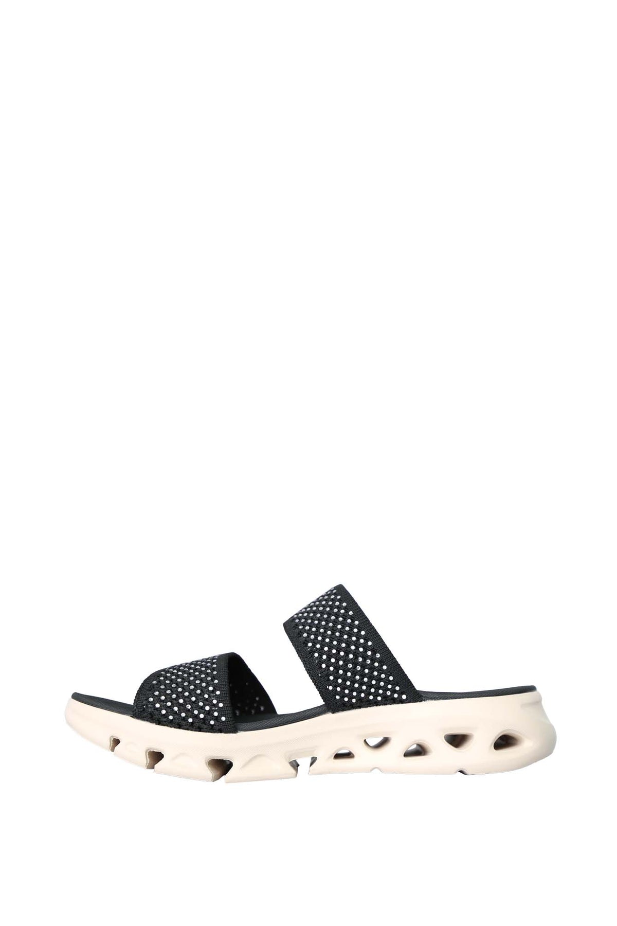 FLOW comfort sandal. fashionable design. It features two wide black fabric straps adorned with shimmering rhinestones that add a touch of elegance and sparkle. Features is the lightweight, The sole includes innovative cut-out grooves, which not only reduce weight but also enhance shock absorption and flexibility during walking. This design allows for a natural foot movement and improved traction.