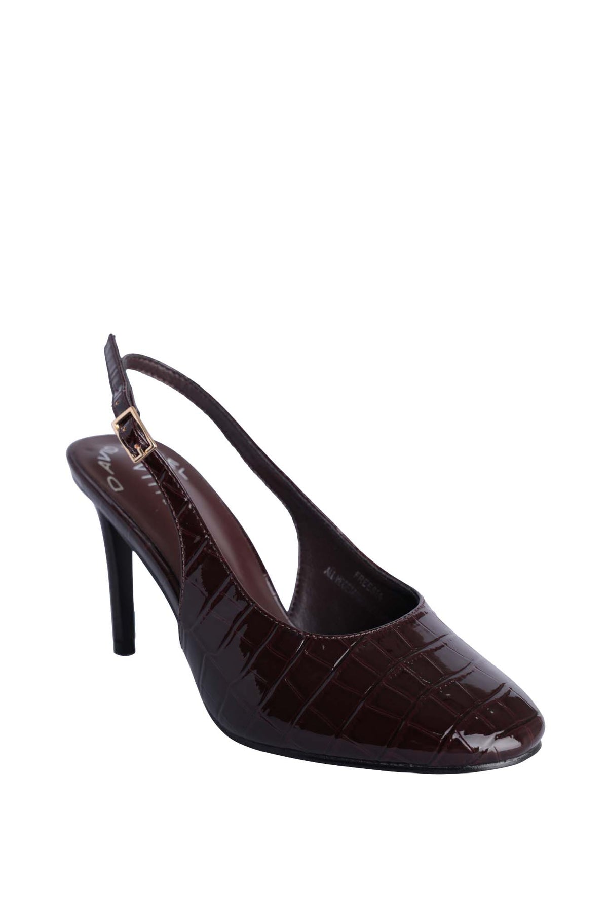 FREESIA slingback high-heel shoes with a pointed toe design. Features a slim stiletto heel, a closed front, and an adjustable strap around the back for support. The textured finish on the upper adds a refined and elegant touch, making it suitable for both formal and semi-formal occasions.