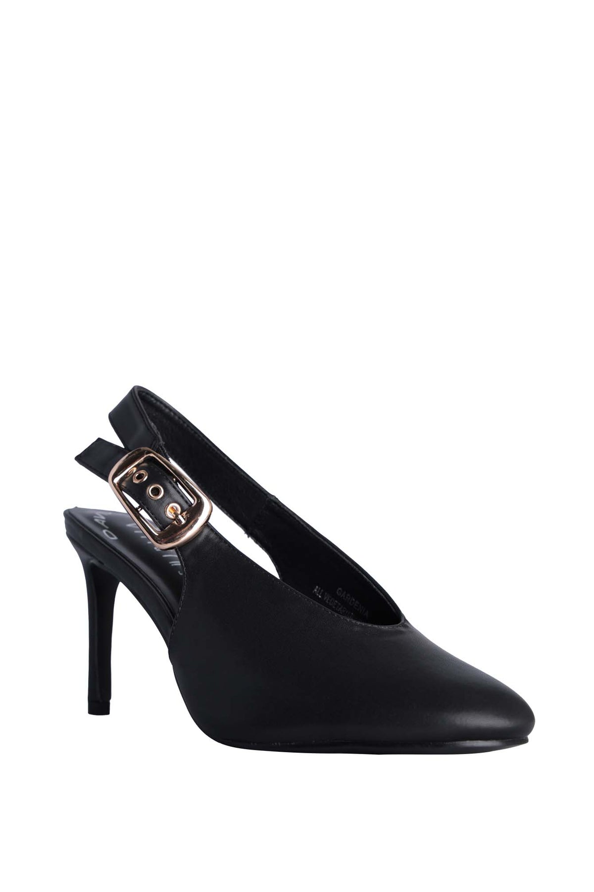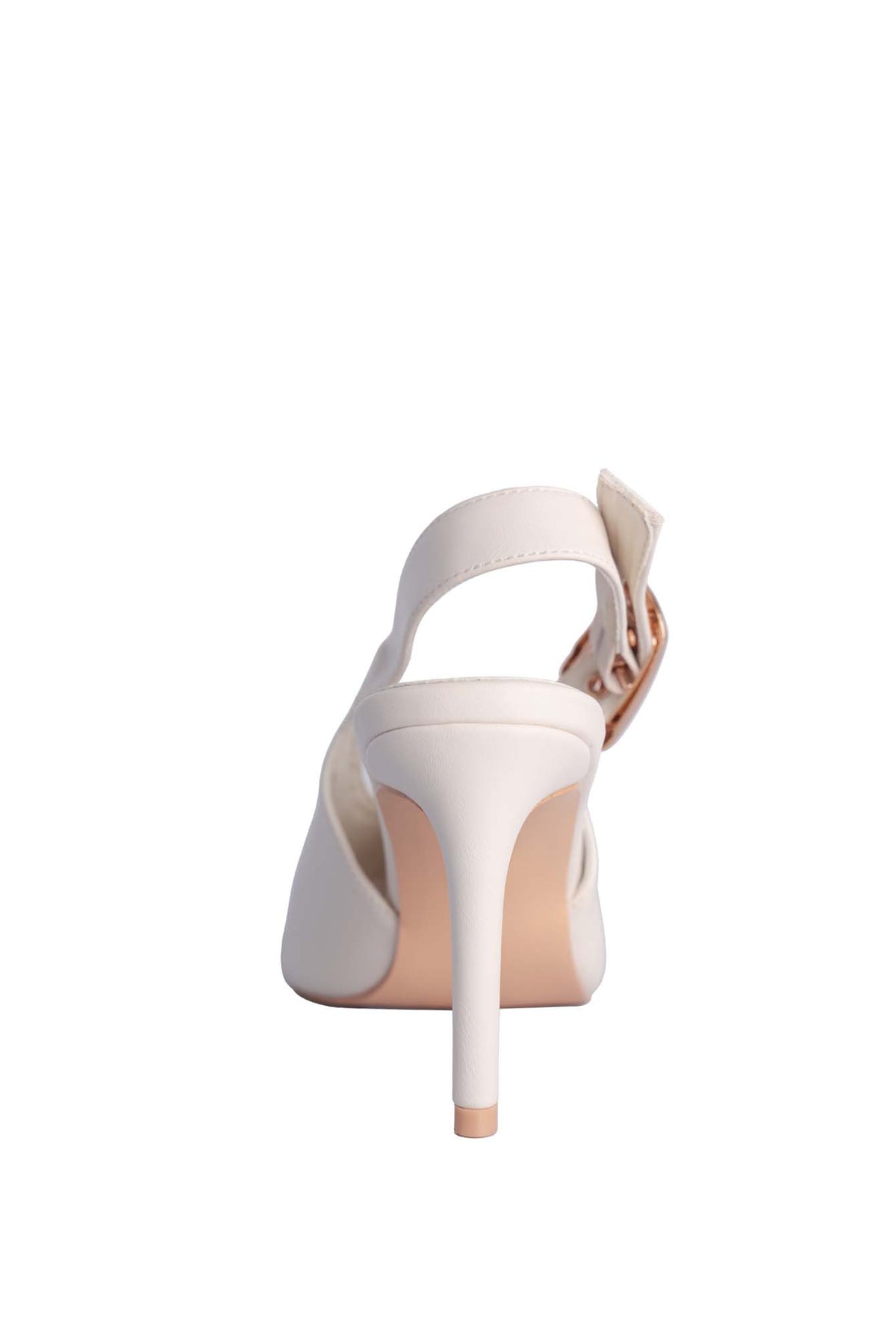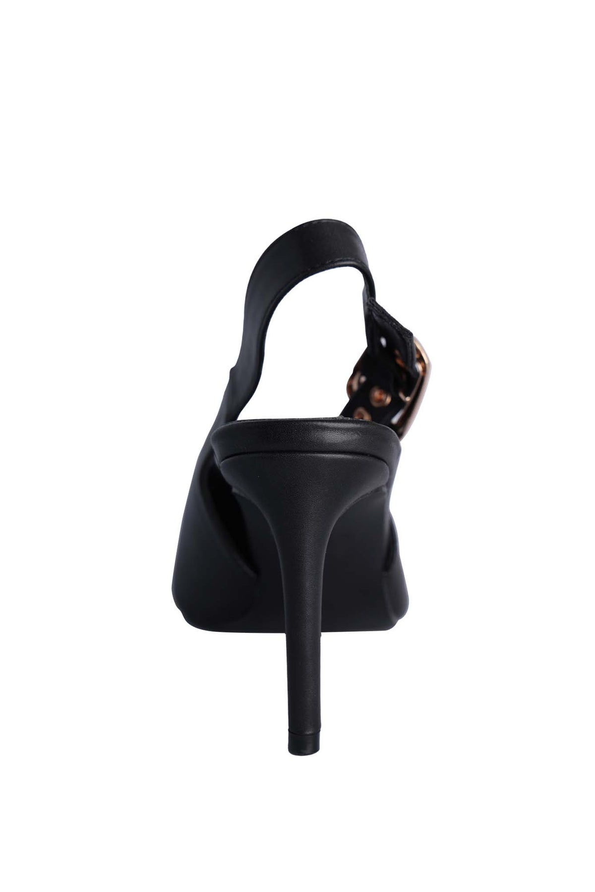 GARDENIA high-heel slingback. Features a pointed toe design and a slim stiletto heel that adds elegance and height. The slingback strap is secured with a gold-tone buckle, allowing for an adjustable fit while adding a touch of sophistication. This shoe is perfect for formal occasions, evening wear, or pairing with chic office outfits.