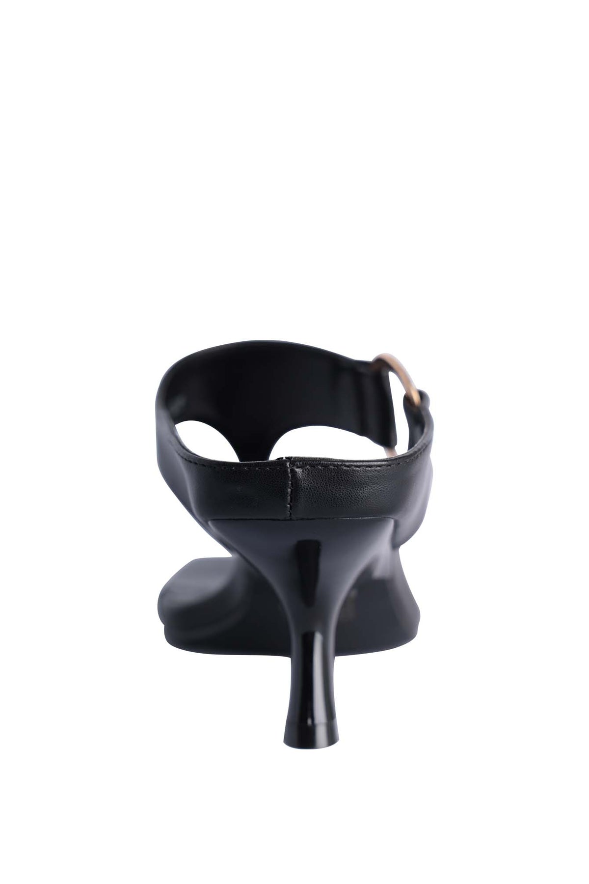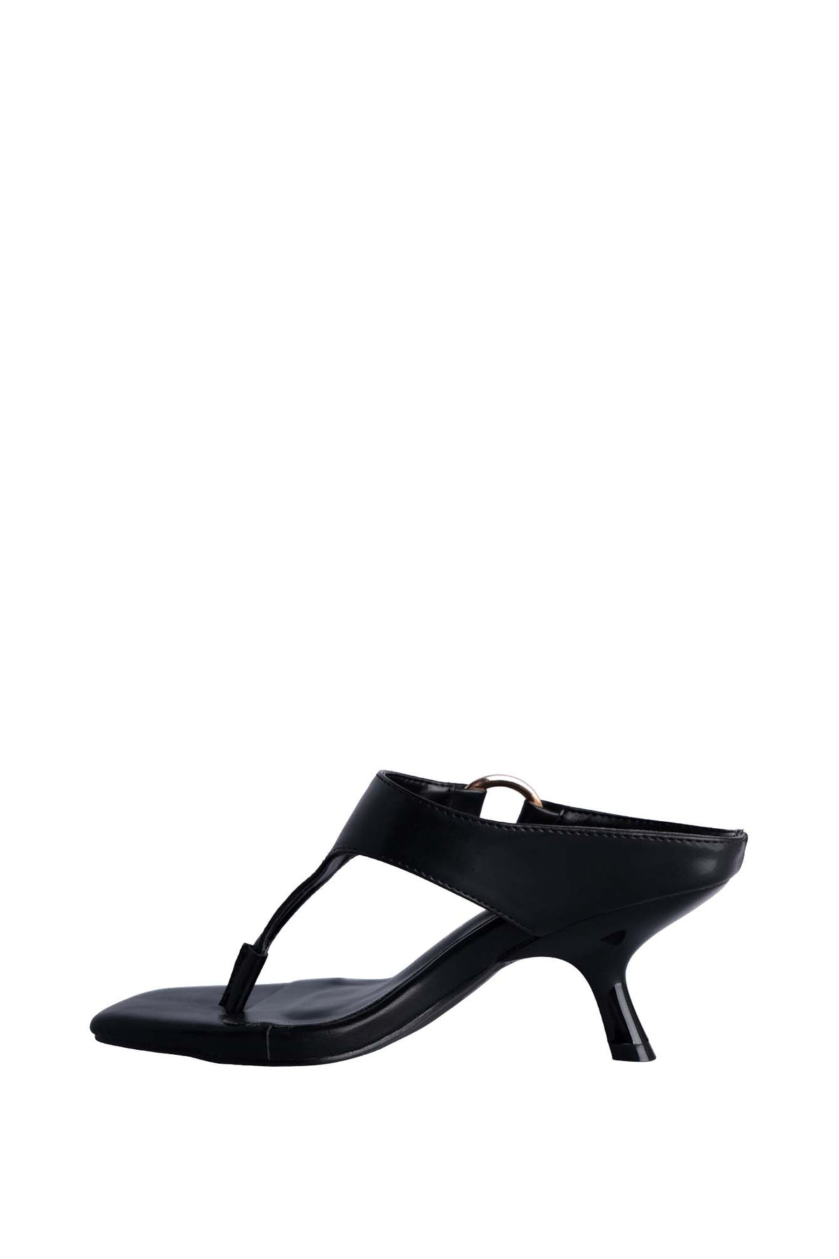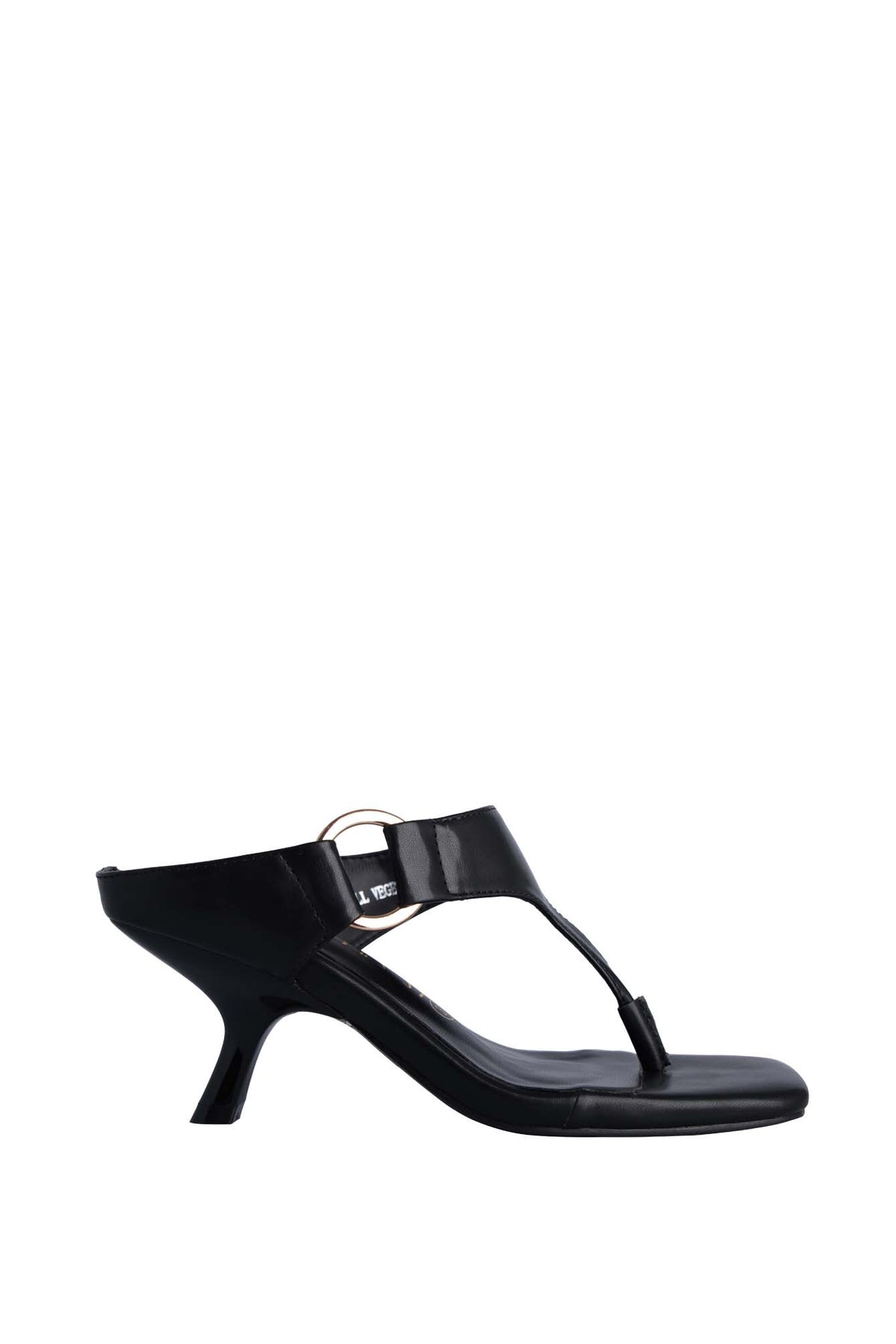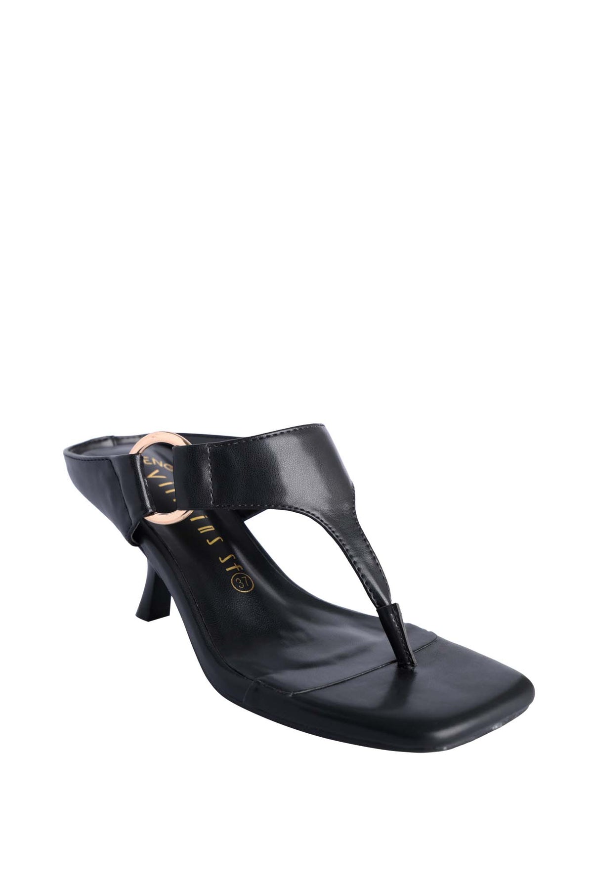 GENTIAN heel sandal with a thong-style front strap. Features a wide leather strap across the foot, accented with a large gold circular buckle for decoration. The shoe has a square toe design and a slim mid-height heel, giving it a modern and elegant look. It combines comfort with a chic, fashionable appearance, making it suitable for both casual and dressy occasions.