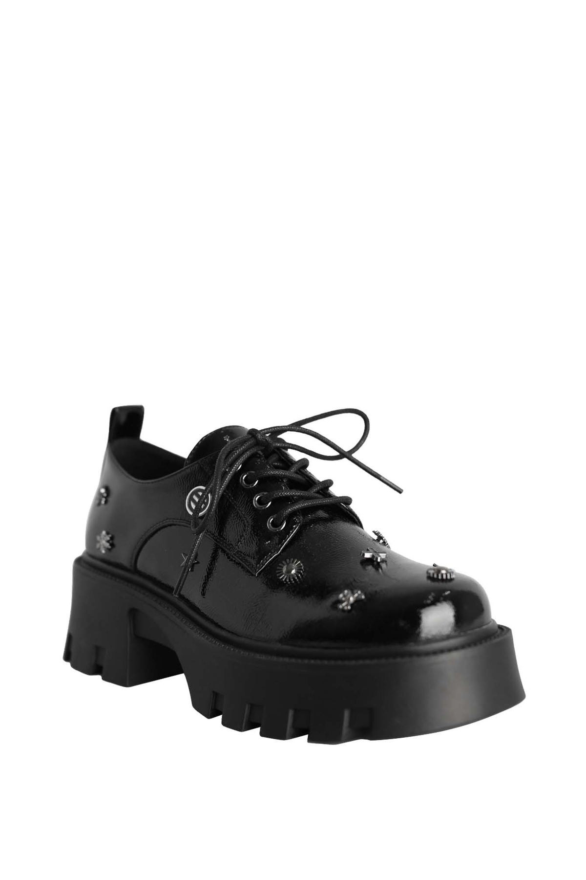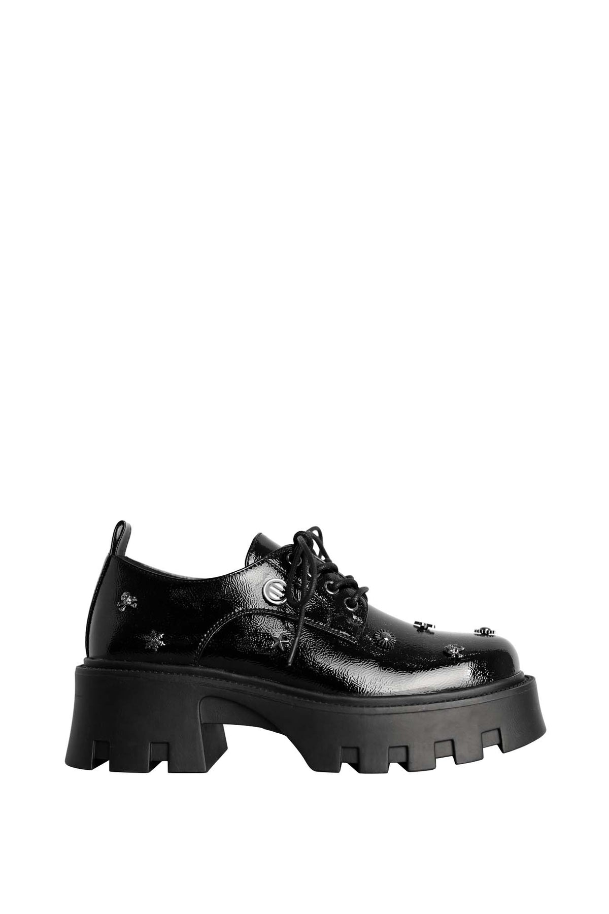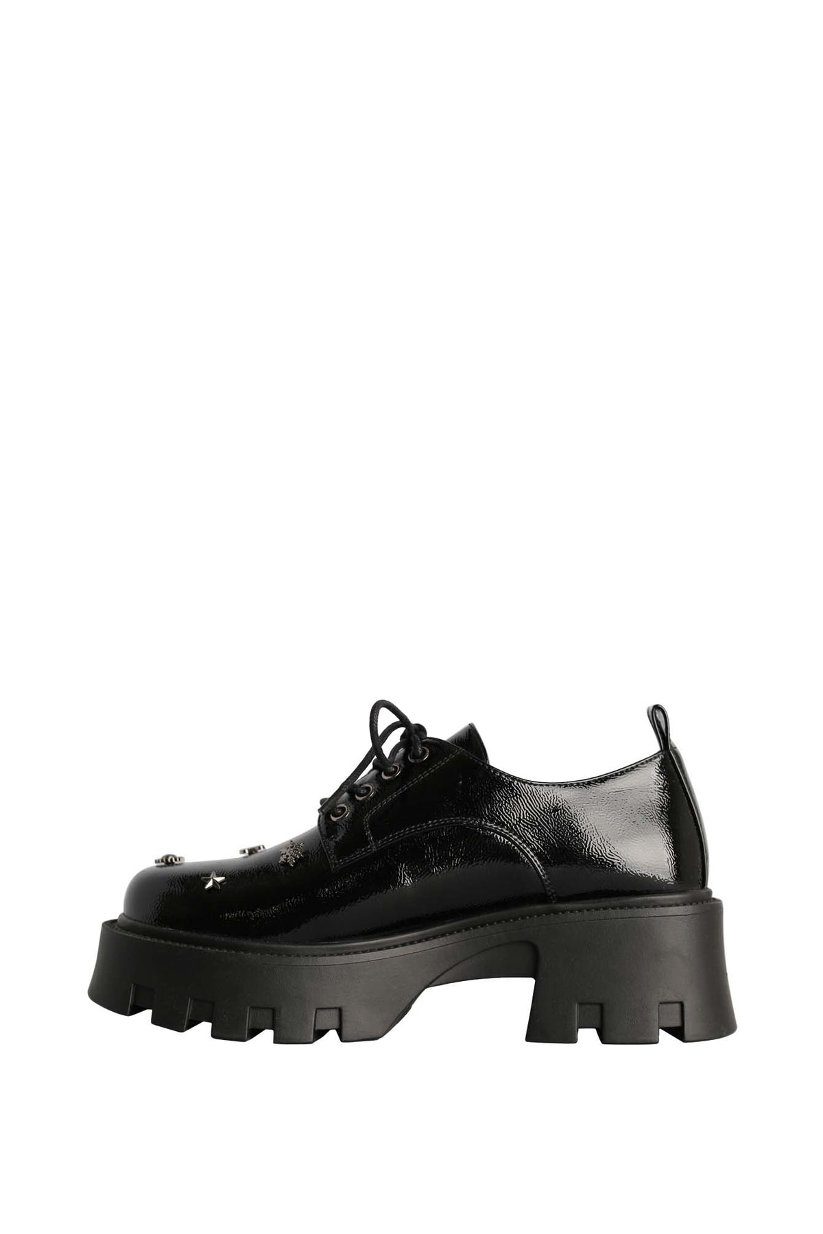 IRON, Platform lace-up shoes with a bold, edgy vibe. They feature a chunky lug sole that adds height and a strong, modern look. The glossy finish gives them a sleek feel, while the metal studs and decorative hardware across the upper add a cool, punk-inspired touch. Sturdy, stylish, and eye-catching—perfect for making a statement while staying comfortable.
