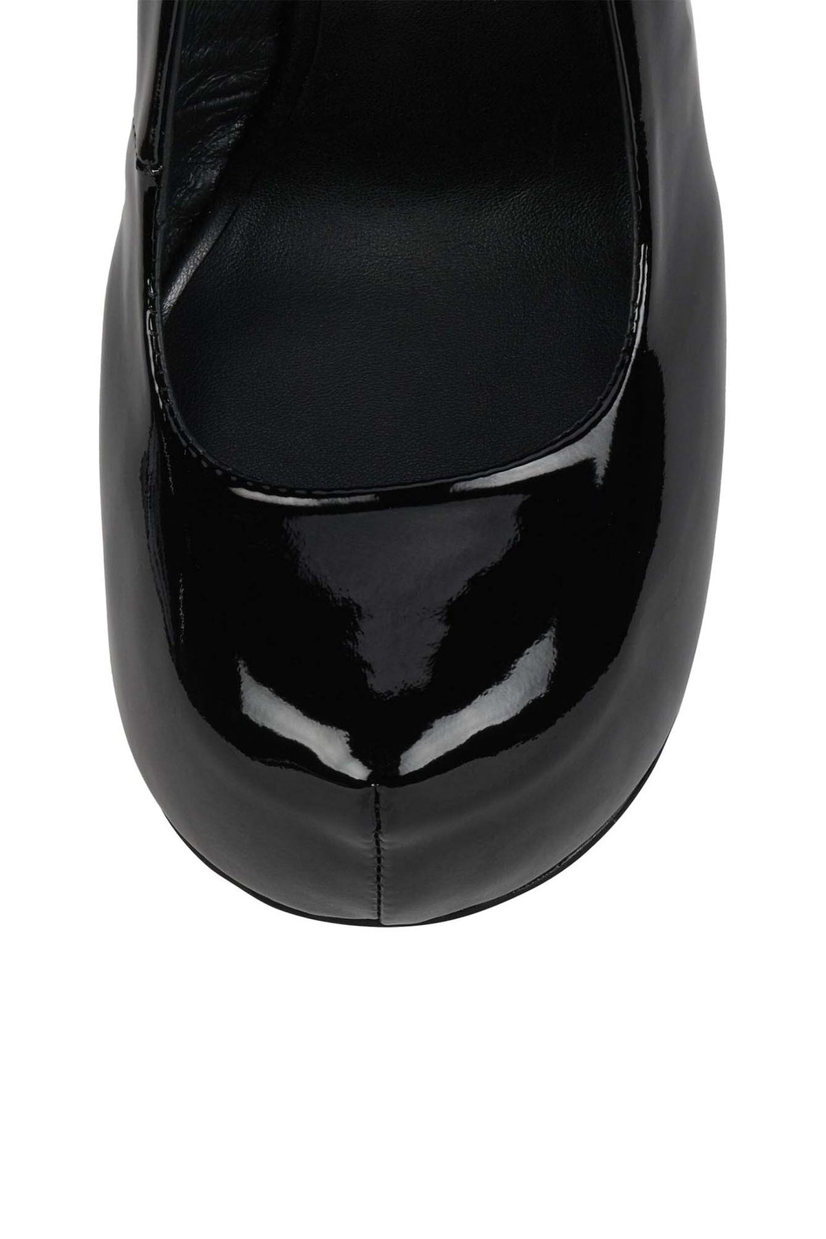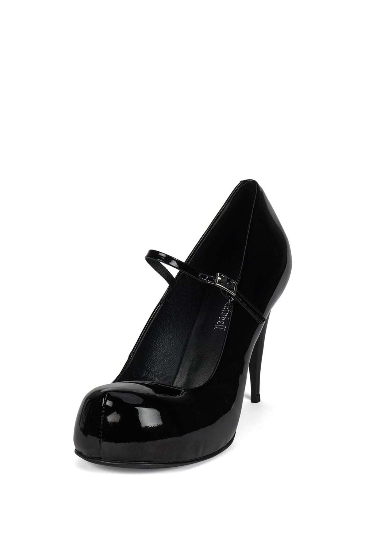 JINKIES chic black high heel features a glossy patent finish and a modern rounded-square toe that adds a fashionable edge. The Mary Jane strap enhances both style and support, while the subtle platform and slim stiletto heel create an elegant, confident silhouette.