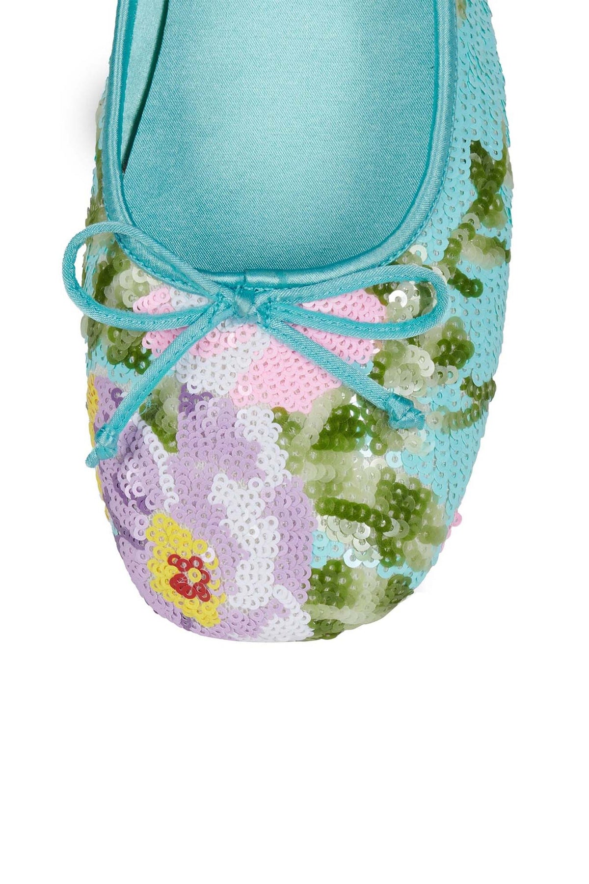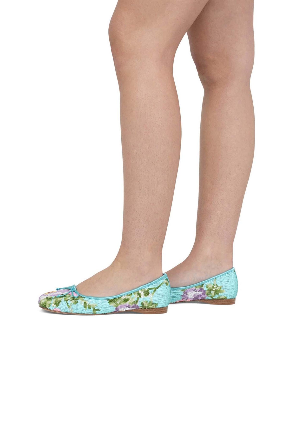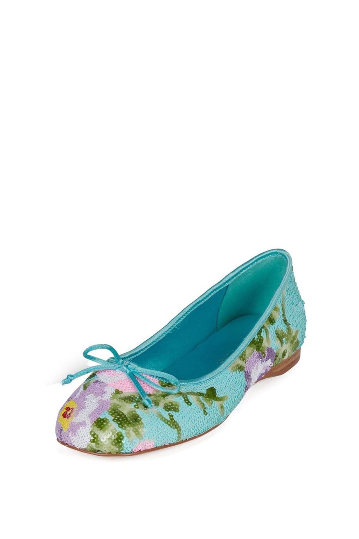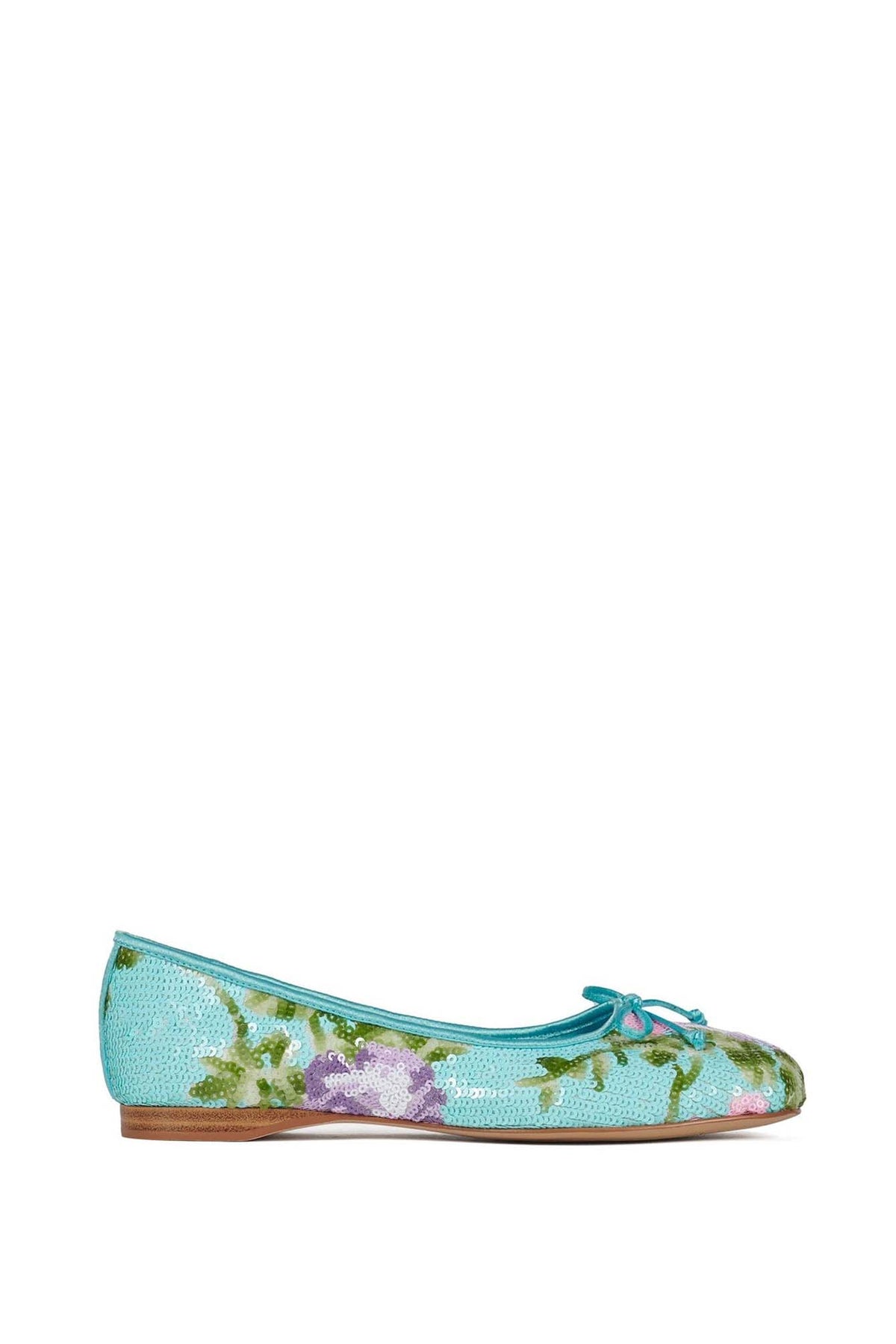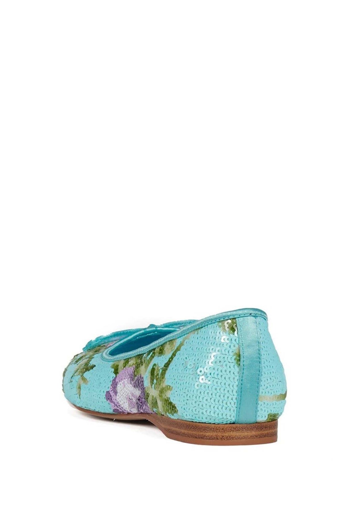 KALLI-SEQ charming flat features a refreshing turquoise base adorned with delicate floral sequin embroidery that sparkles beautifully with every step. Finished with a sweet front bow and a slim, comfortable sole, it blends elegance with everyday ease. Perfect for brightening casual looks or adding a playful touch to dresses