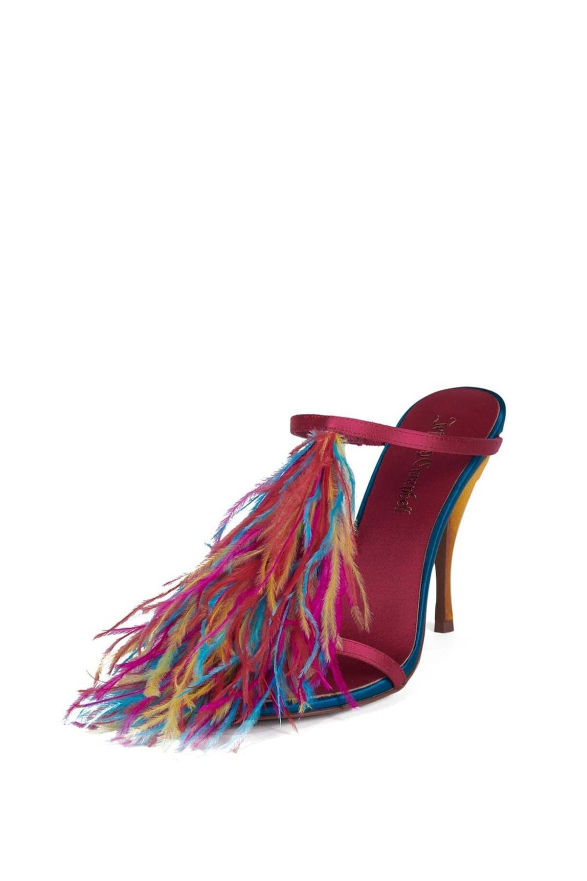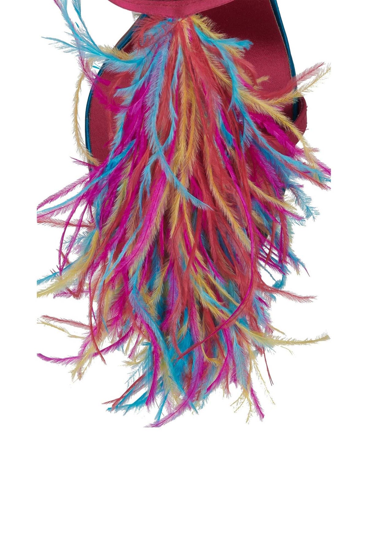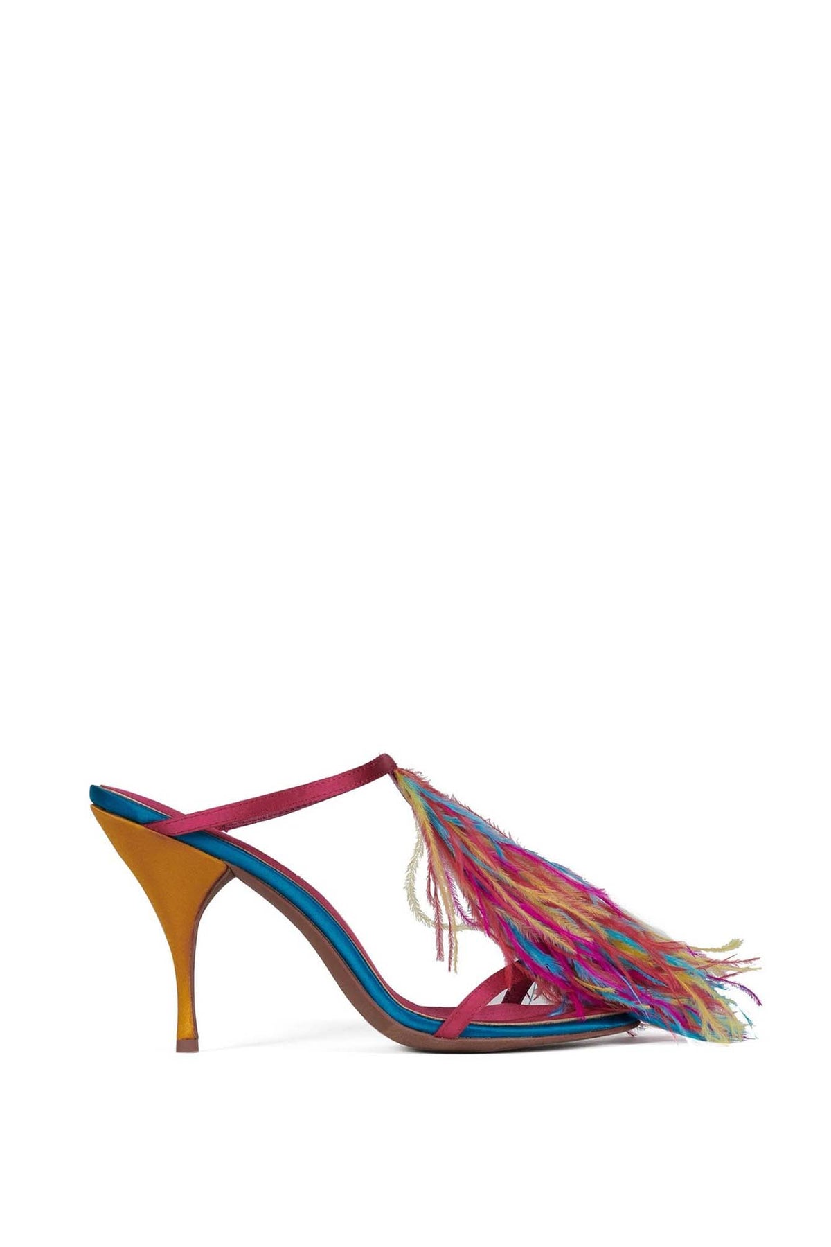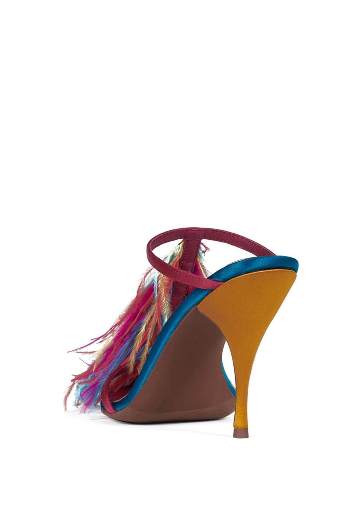 PLUMA, fashion-forward stiletto mule heel with a bold, playful vibe. Features a sleek high heel and slim double straps for a delicate, elegant look. The highlight is the colorful feather embellishment at the front, adding movement, texture, and a statement-making flair. The vibrant mix of colors gives the shoe a fun, artistic, and runway-inspired feel—perfect for parties, fashion events, or anyone who loves to stand out.