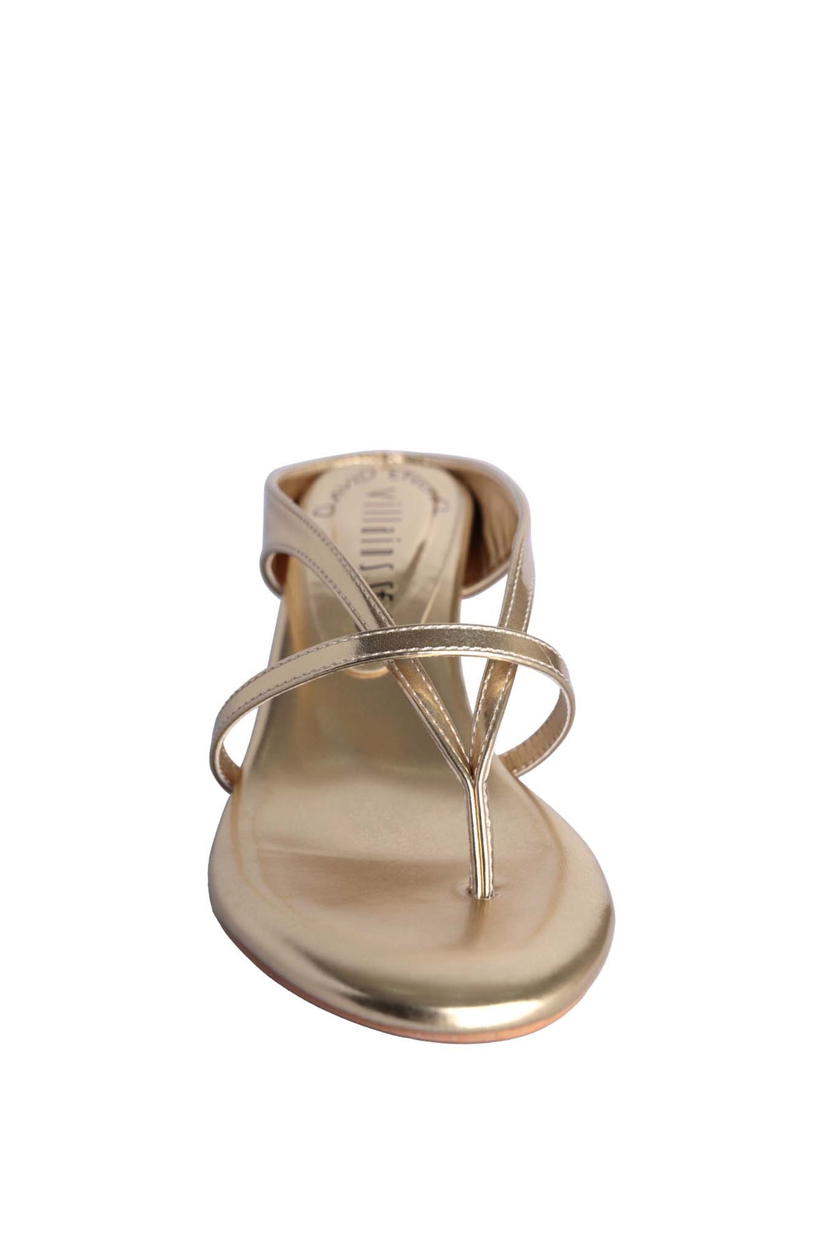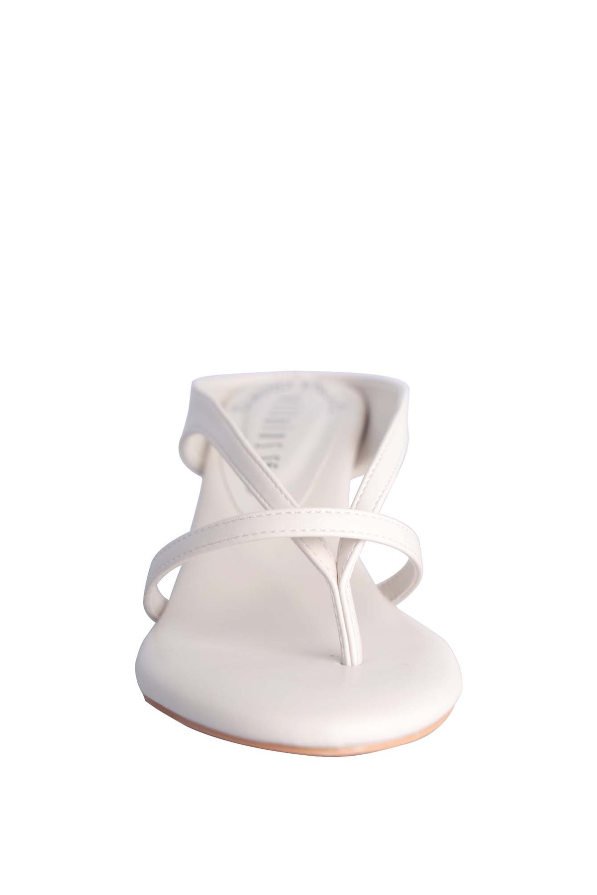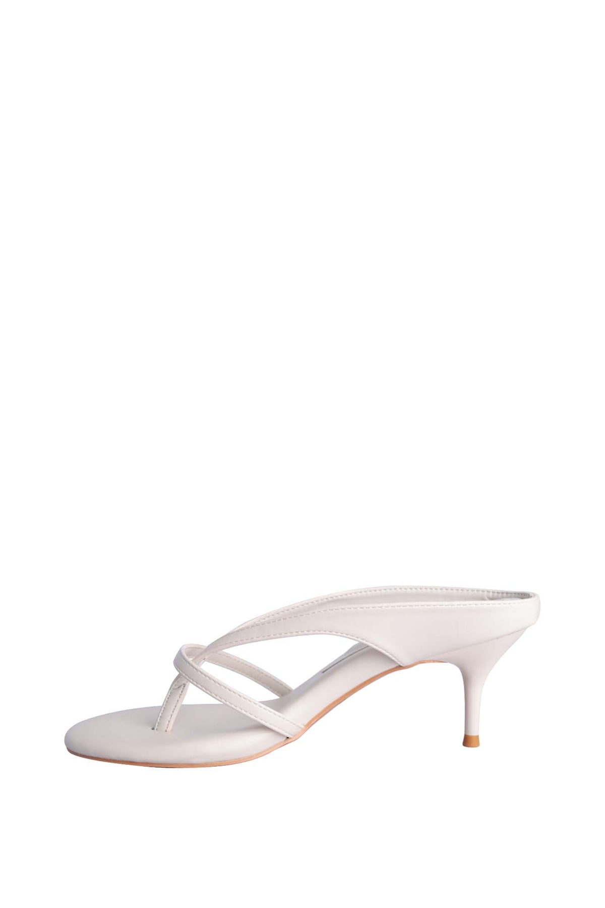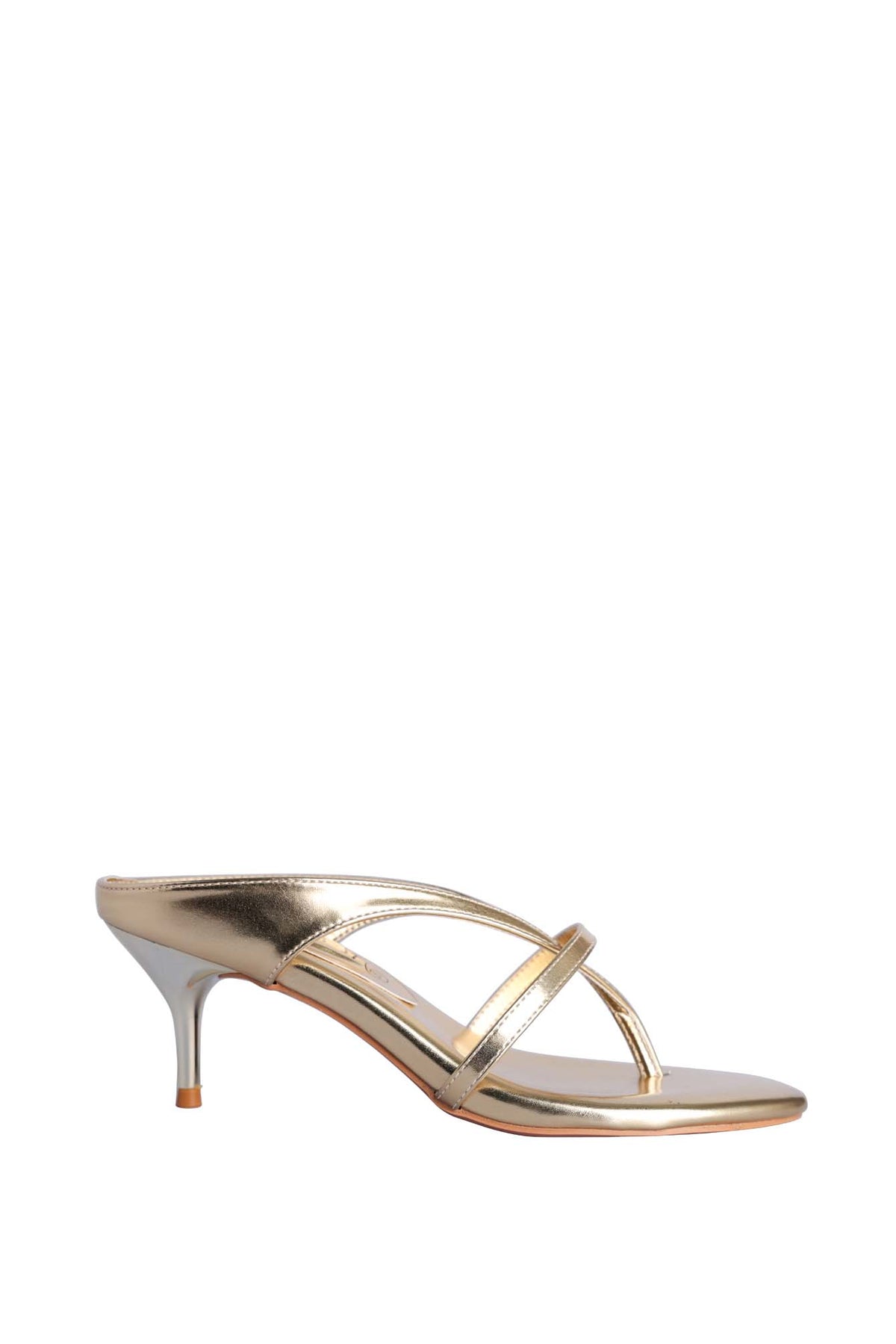WISTERIA kitten heel sandal featuring thin strappy details and a thong-style toe strap. The shoe has a modest heel height that provides a subtle lift while maintaining comfort. The minimalist design makes it suitable for both casual and semi-formal occasions.