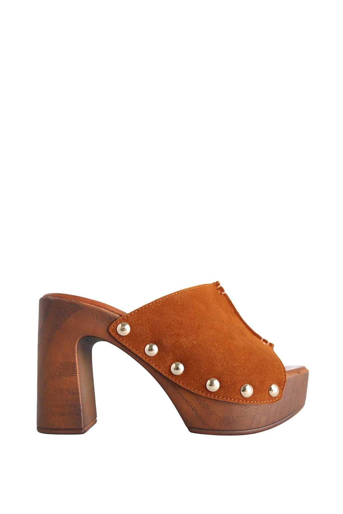 WOODLYN women's mule or clog-style sandal with a high, chunky wooden heel and a wooden platform sole. The upper is an open-toe, wide strap made of brown suede. It is decorated with gold or brass-colored metal studs along the side where the upper meets the sole.