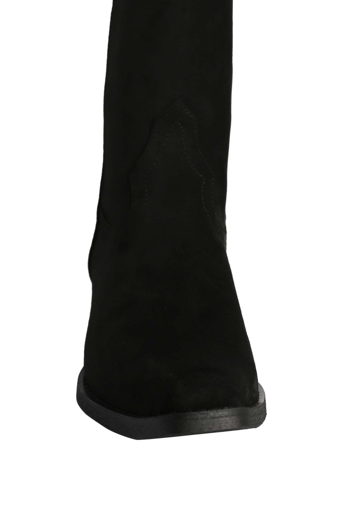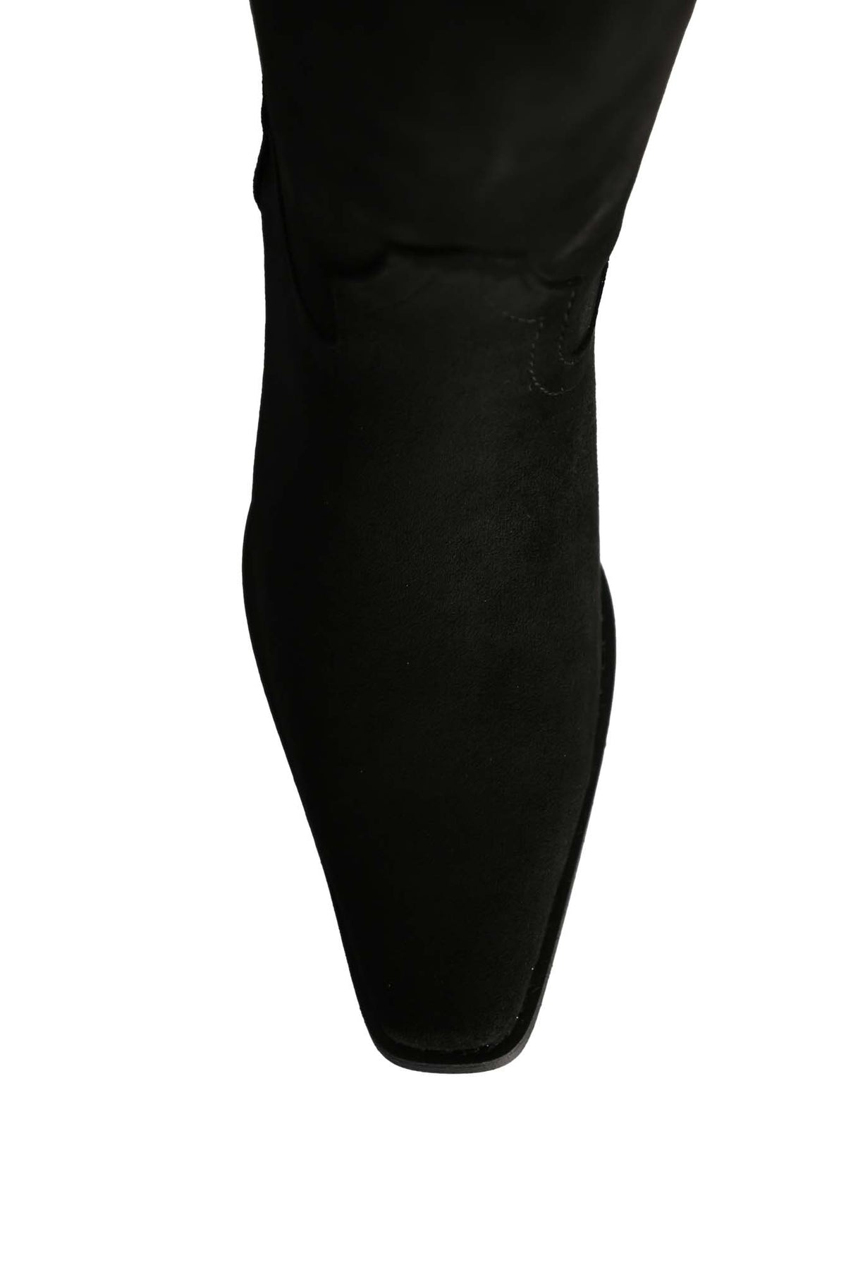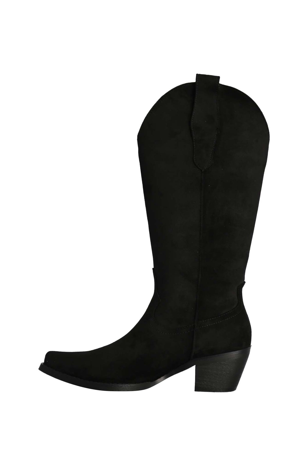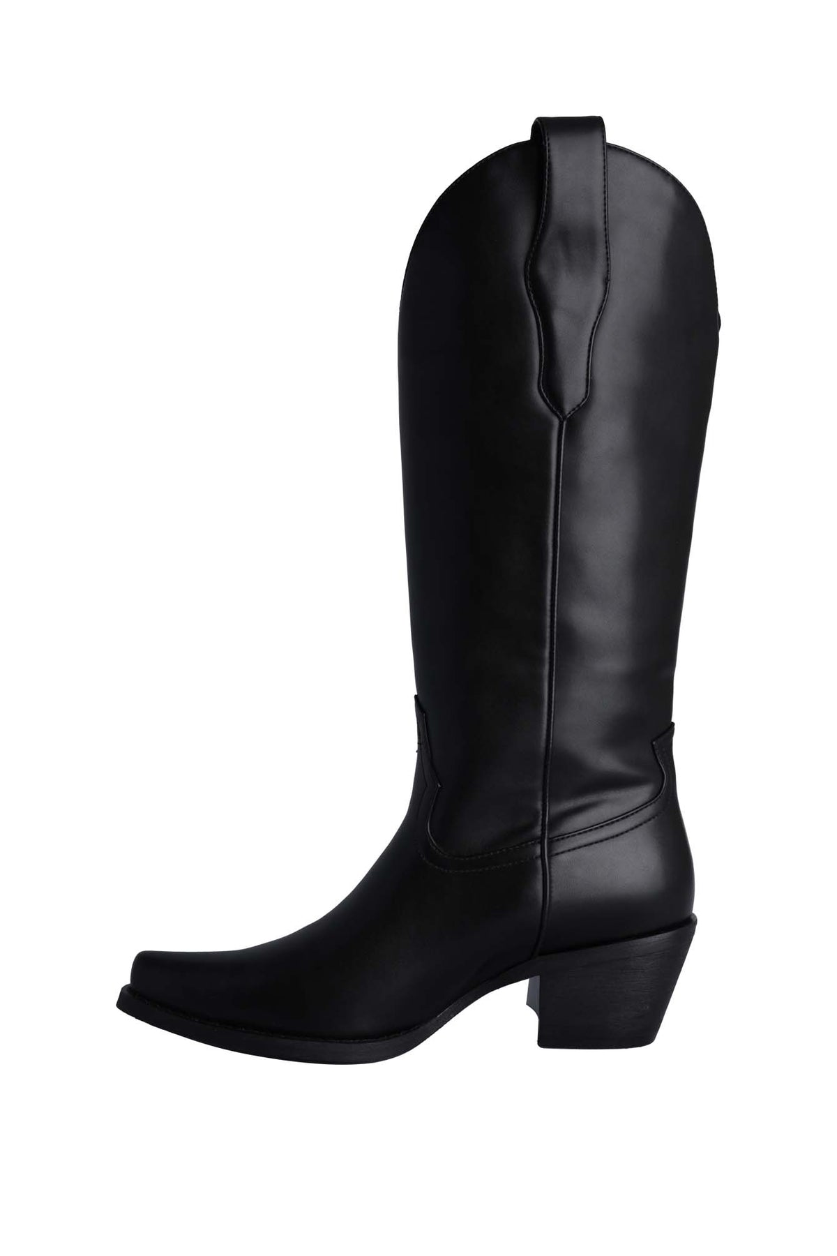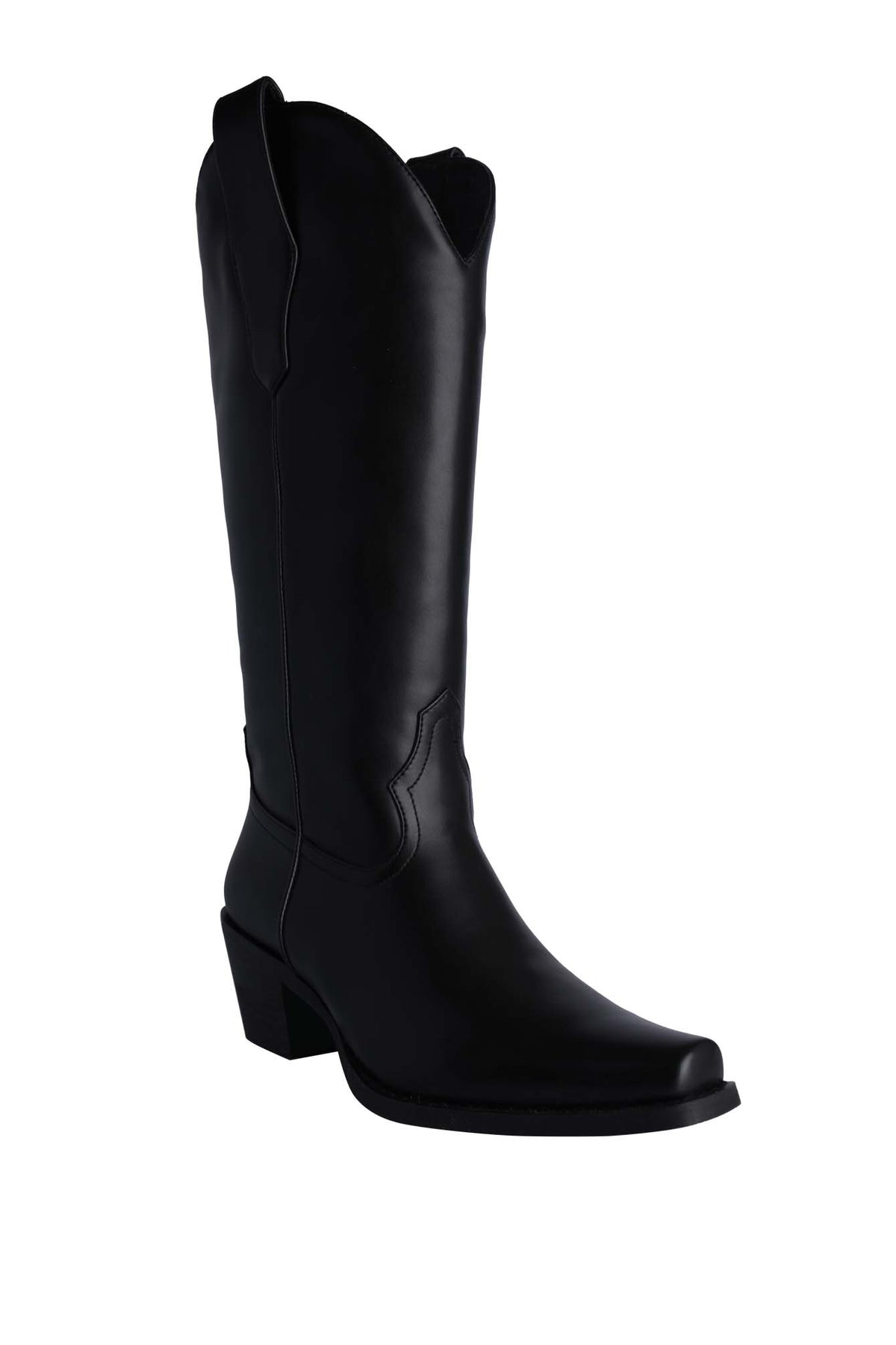 SHADOW LUST-Pรองเท้าบู๊ตคาวบอย ดีไซน์เรียบง่ายแต่ดูโฉบเฉี่ยว โดดเด่นด้วยหัวรองเท้าทรงเหลี่ยมและส้นเตี้ยทำมุม ซึ่งเป็นจุดเด่นของรองเท้าบู๊ตสไตล์คาวบอย ปลายรองเท้าสูงและมีทรง V-cut ลึกแบบดั้งเดิมที่ด้านบน ดีไซน์โดยรวมเรียบง่ายแต่โดดเด่นด้วยโทนสีเดียว ปราศจากงานปักหรือการตกแต่งแบบเดิมๆ ทำให้รองเท้าดูทันสมัยและหรูหรา
