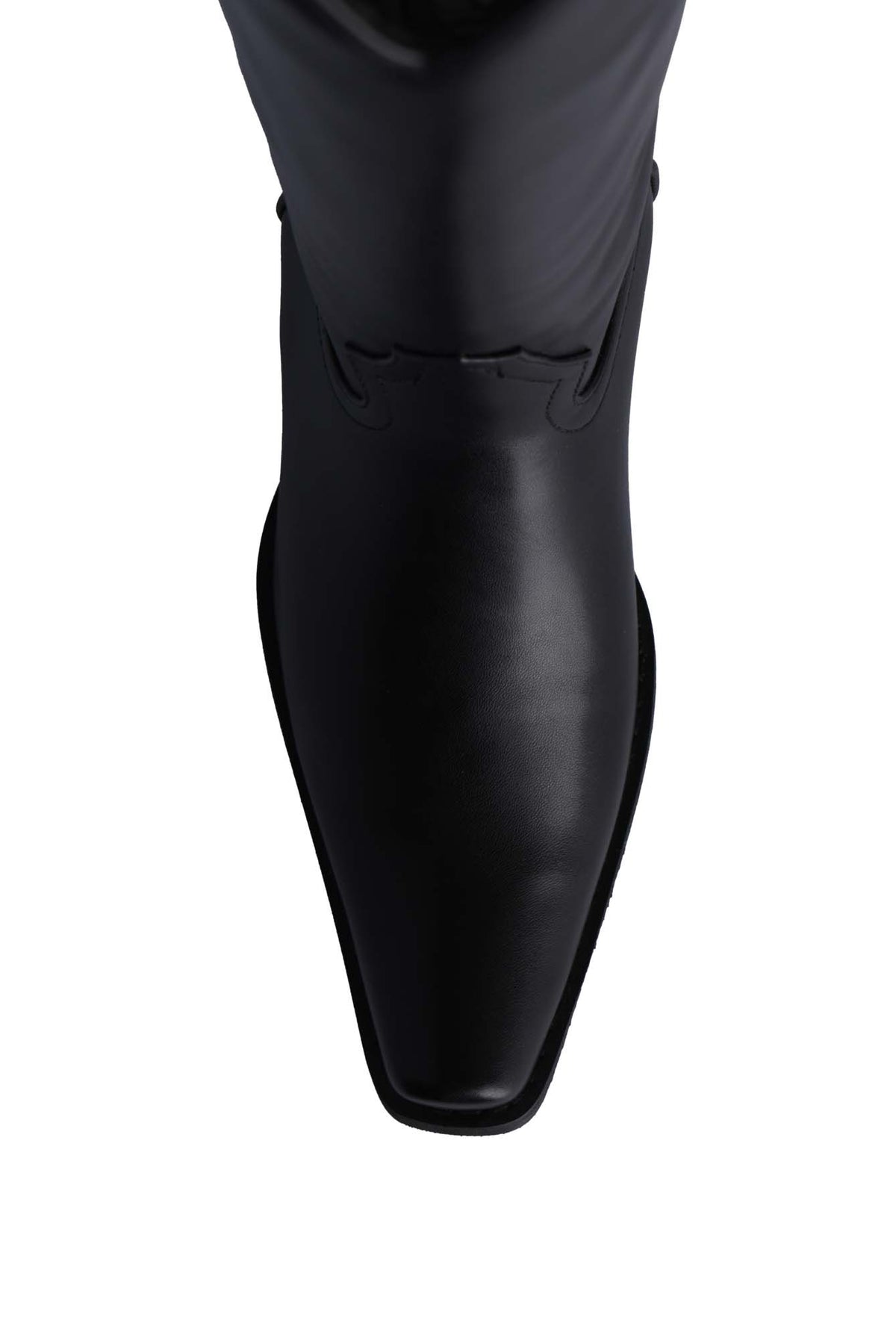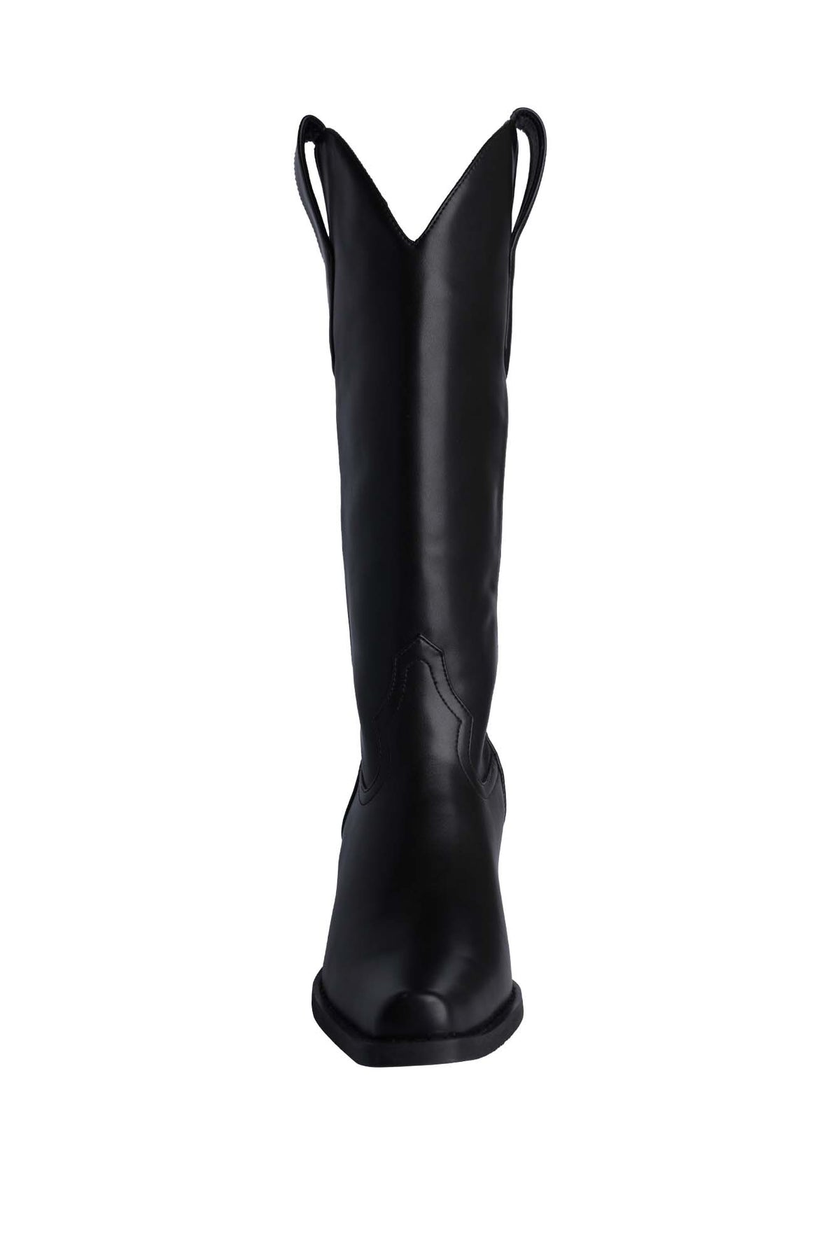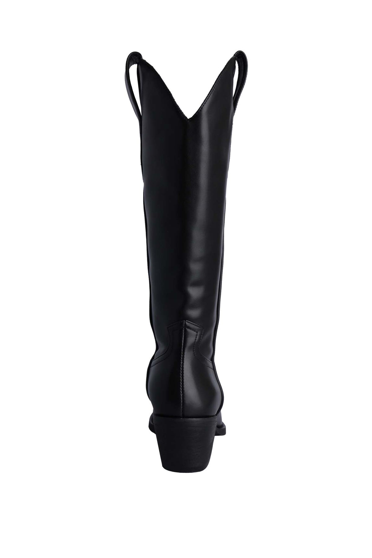 SHADOW LUST-Pรองเท้าบู๊ตคาวบอย ดีไซน์เรียบง่ายแต่ดูโฉบเฉี่ยว โดดเด่นด้วยหัวรองเท้าทรงเหลี่ยมและส้นเตี้ยทำมุม ซึ่งเป็นจุดเด่นของรองเท้าบู๊ตสไตล์คาวบอย ปลายรองเท้าสูงและมีทรง V-cut ลึกแบบดั้งเดิมที่ด้านบน ดีไซน์โดยรวมเรียบง่ายแต่โดดเด่นด้วยโทนสีเดียว ปราศจากงานปักหรือการตกแต่งแบบเดิมๆ ทำให้รองเท้าดูทันสมัยและหรูหรา