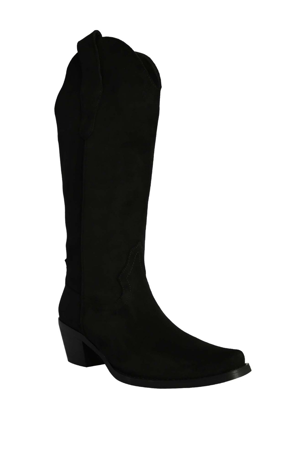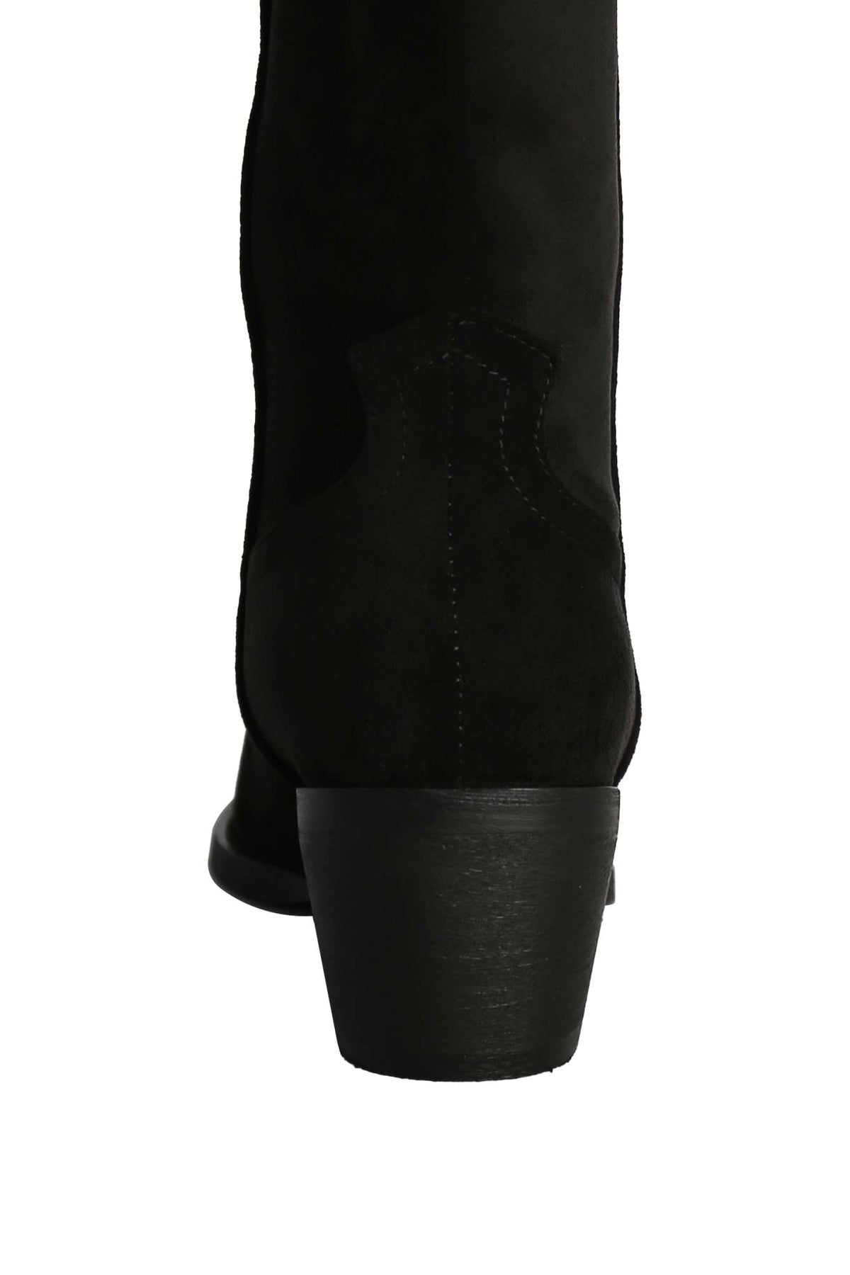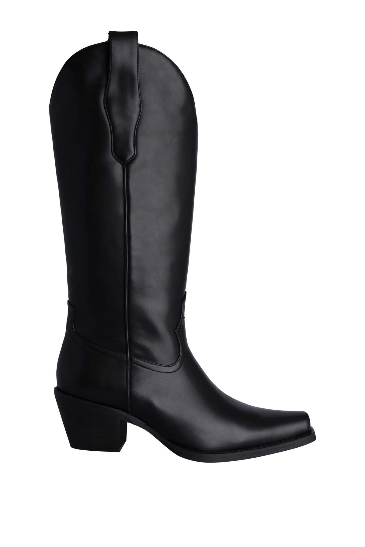 SHADOW LUST-Pรองเท้าบู๊ตคาวบอย ดีไซน์เรียบง่ายแต่ดูโฉบเฉี่ยว โดดเด่นด้วยหัวรองเท้าทรงเหลี่ยมและส้นเตี้ยทำมุม ซึ่งเป็นจุดเด่นของรองเท้าบู๊ตสไตล์คาวบอย ปลายรองเท้าสูงและมีทรง V-cut ลึกแบบดั้งเดิมที่ด้านบน ดีไซน์โดยรวมเรียบง่ายแต่โดดเด่นด้วยโทนสีเดียว ปราศจากงานปักหรือการตกแต่งแบบเดิมๆ ทำให้รองเท้าดูทันสมัยและหรูหรา