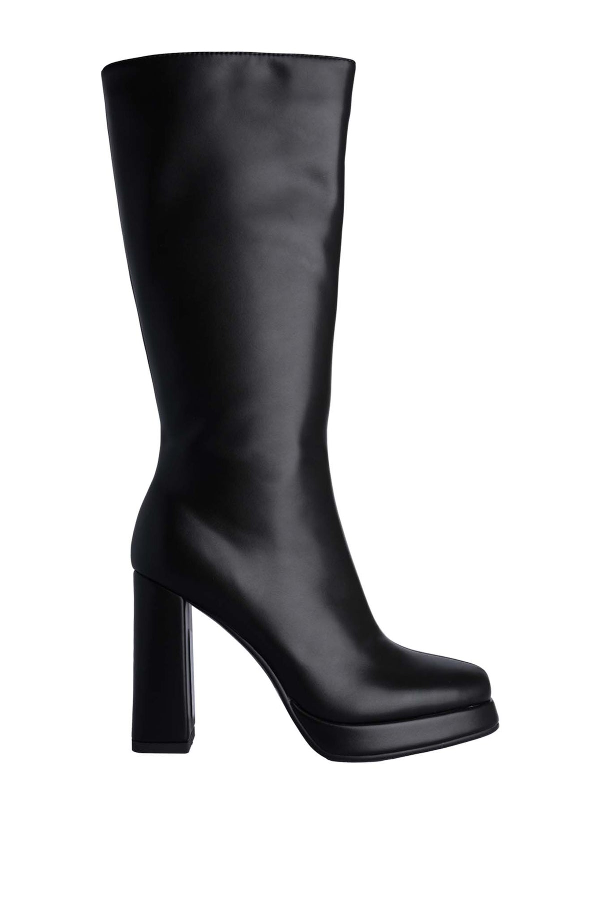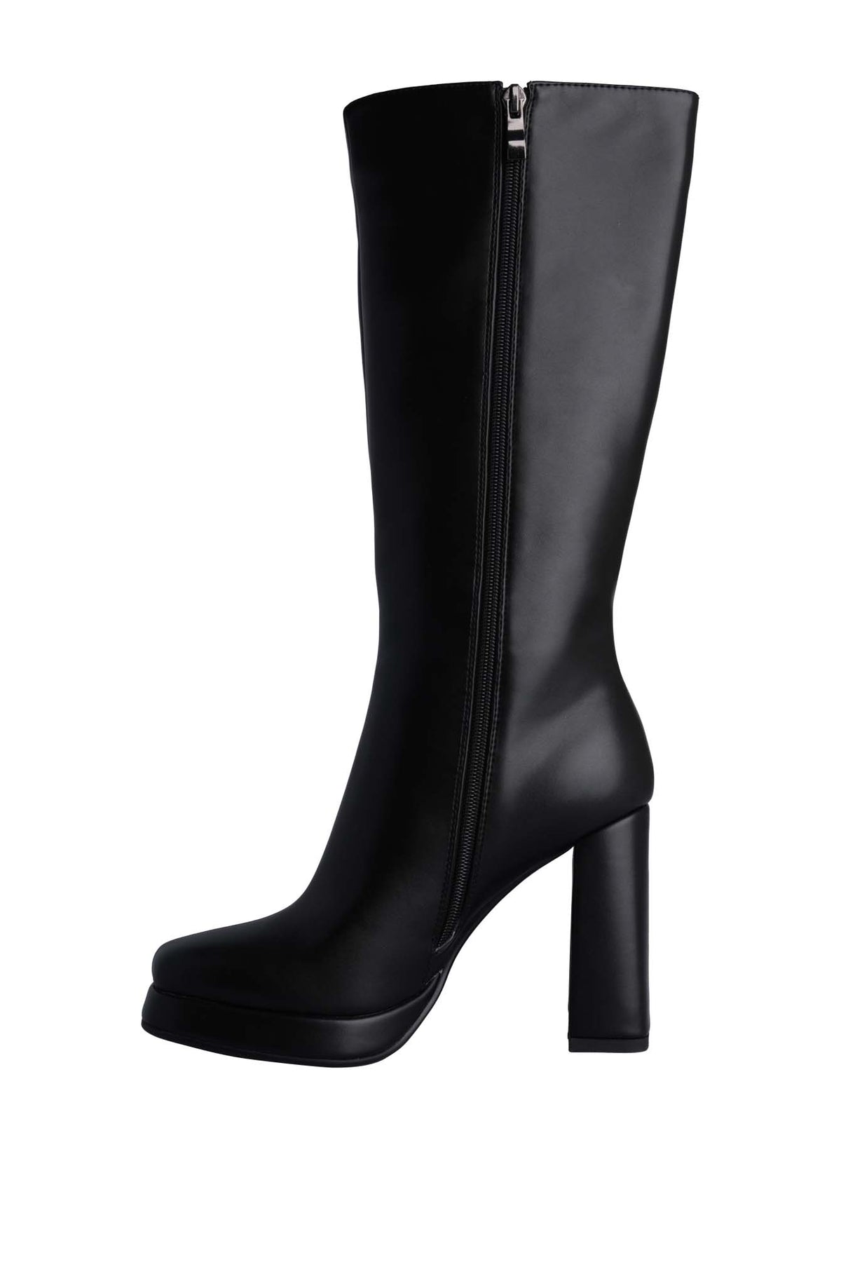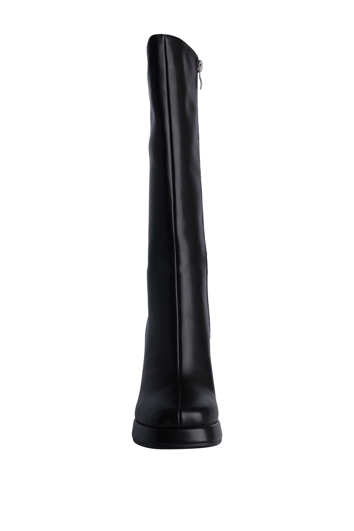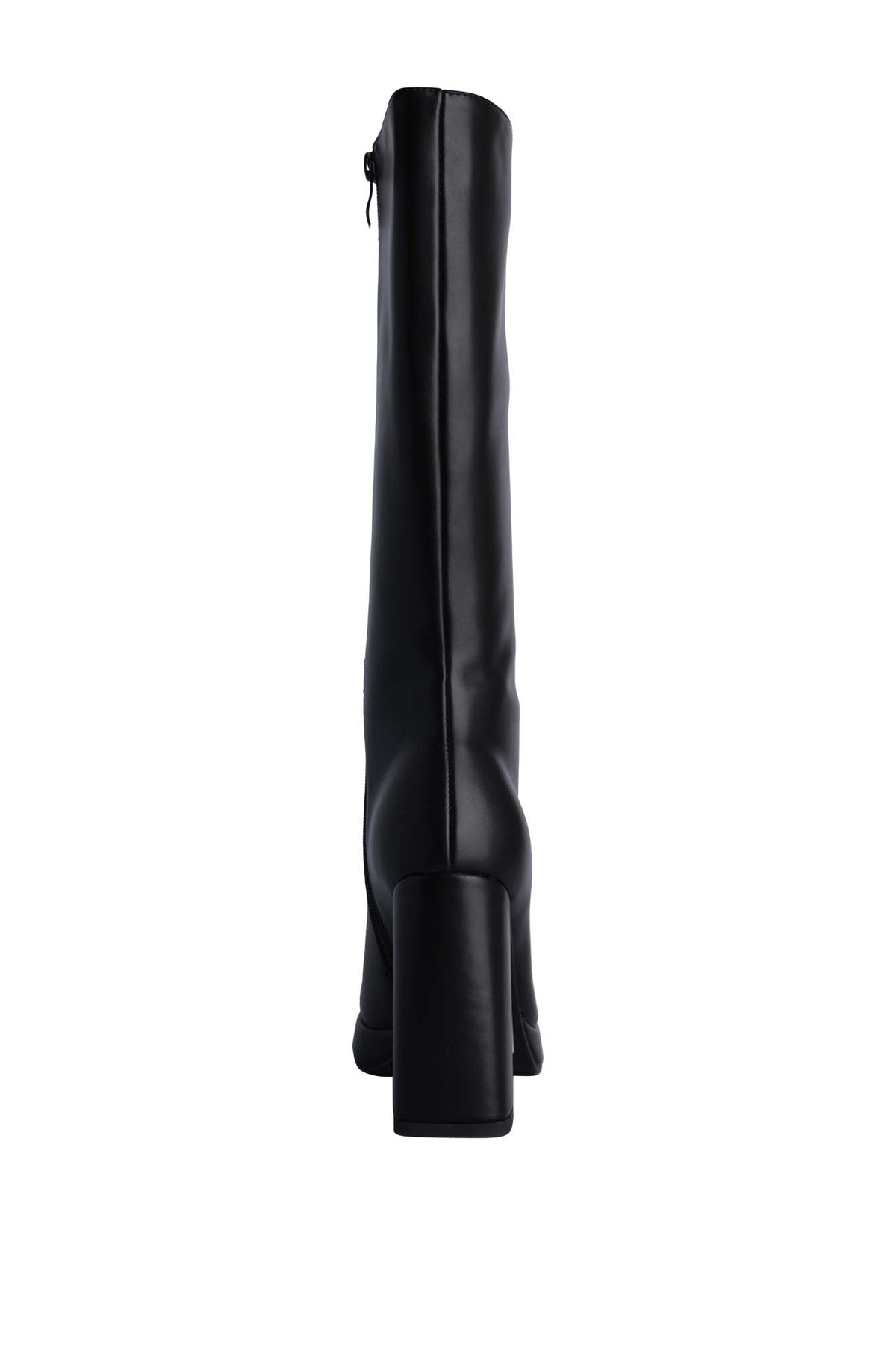 DARK BIND รองเท้าบู๊ทสูงถึงเข่า ส้นสูง ส้นบล็อก พื้นรองเท้าแบบแพลตฟอร์มที่ช่วยเพิ่มความสูง ดีไซน์หัวมน เรียบง่ายแต่ดูสะอาดตา ไร้องค์ประกอบตกแต่งที่มองเห็นได้ ด้านในมีซิป (สวมใส่ง่าย) รองเท้าบู๊ทมีความทันสมัย รองเท้าบู๊ทสไตล์นี้มักถูกเรียกว่า "รองเท้าบู๊ทแบบแพลตฟอร์ม" หรือ "รองเท้าบู๊ทส้นหนา" และเป็นที่นิยมสำหรับทั้งโอกาสลำลองและงานทางการ
